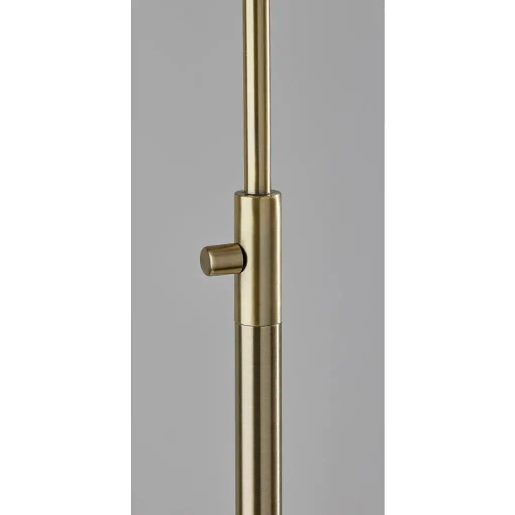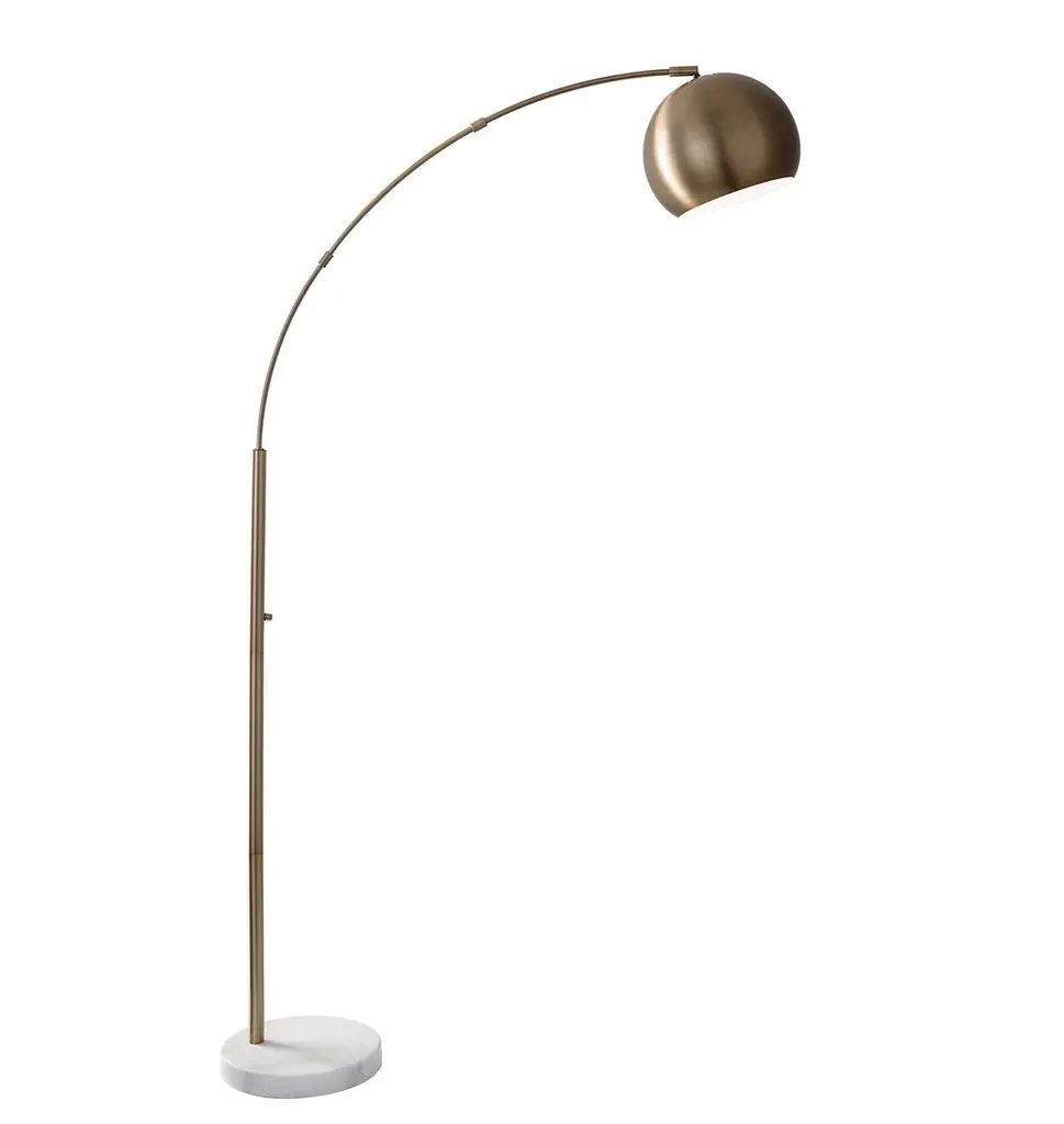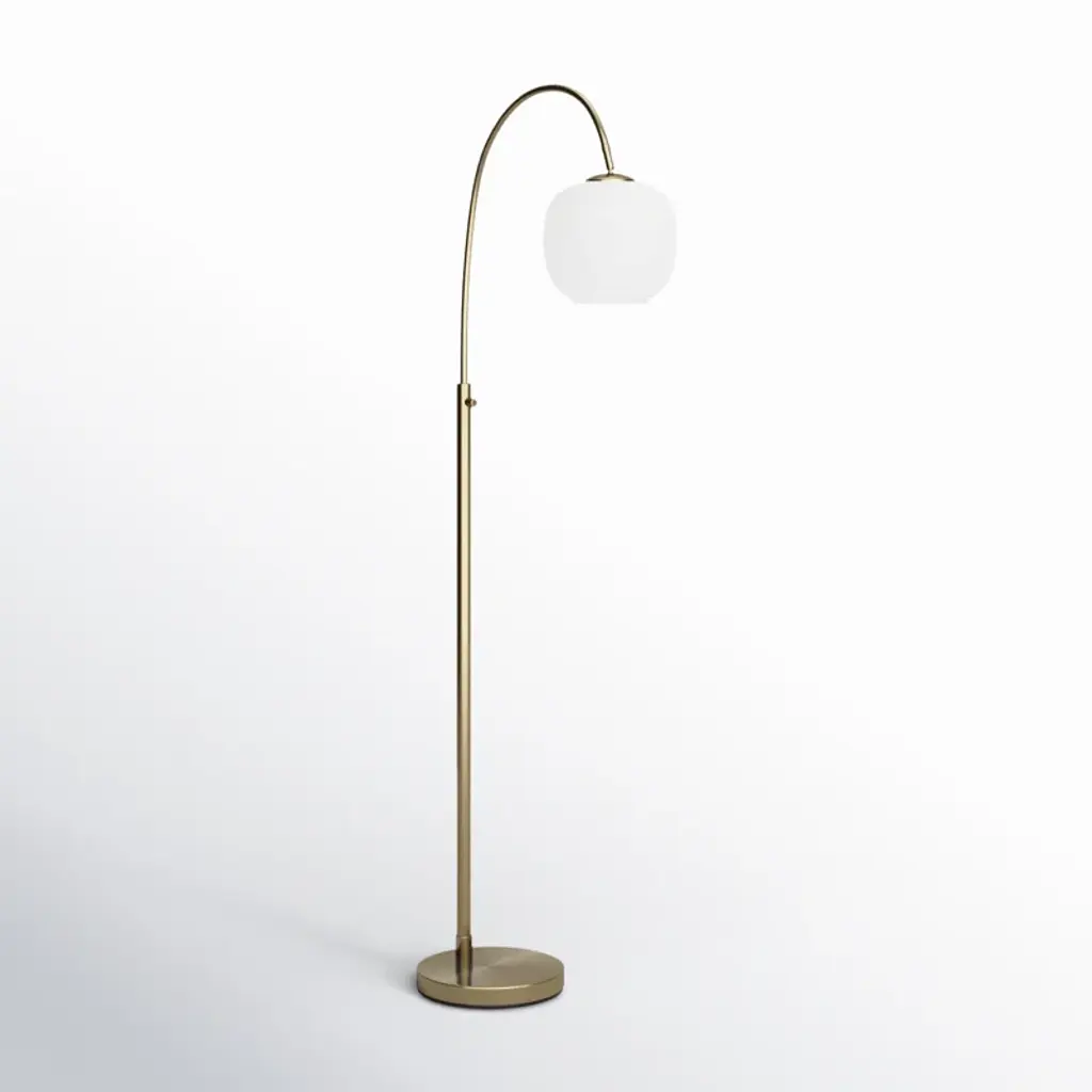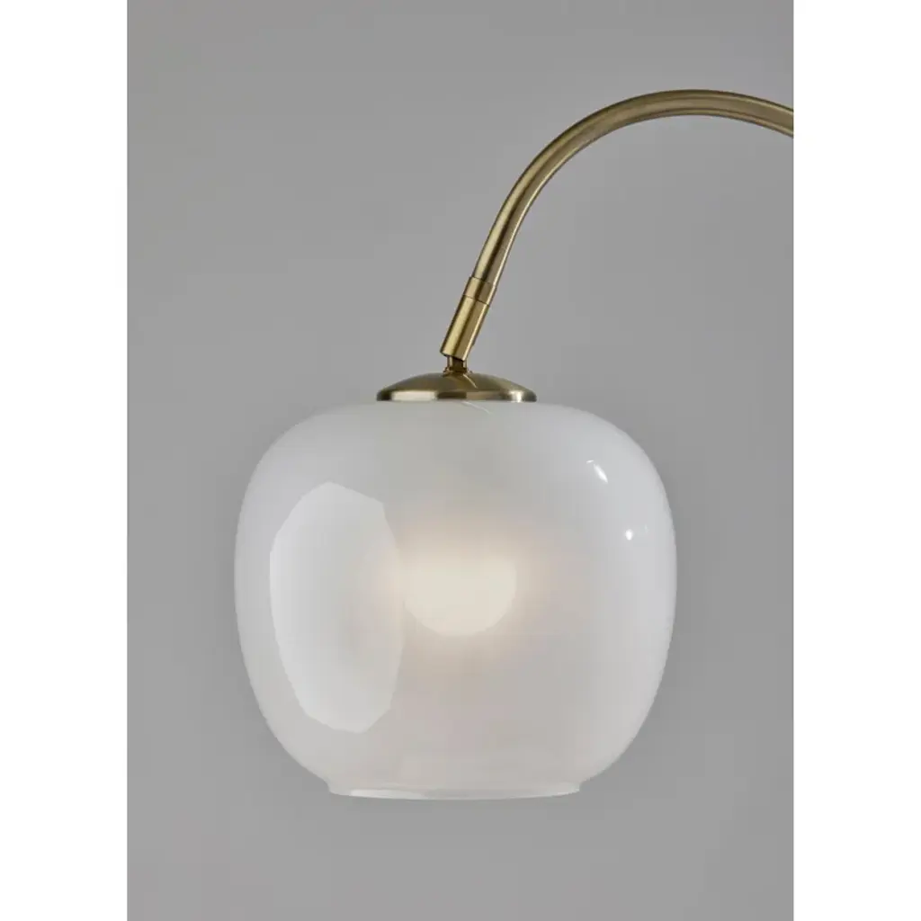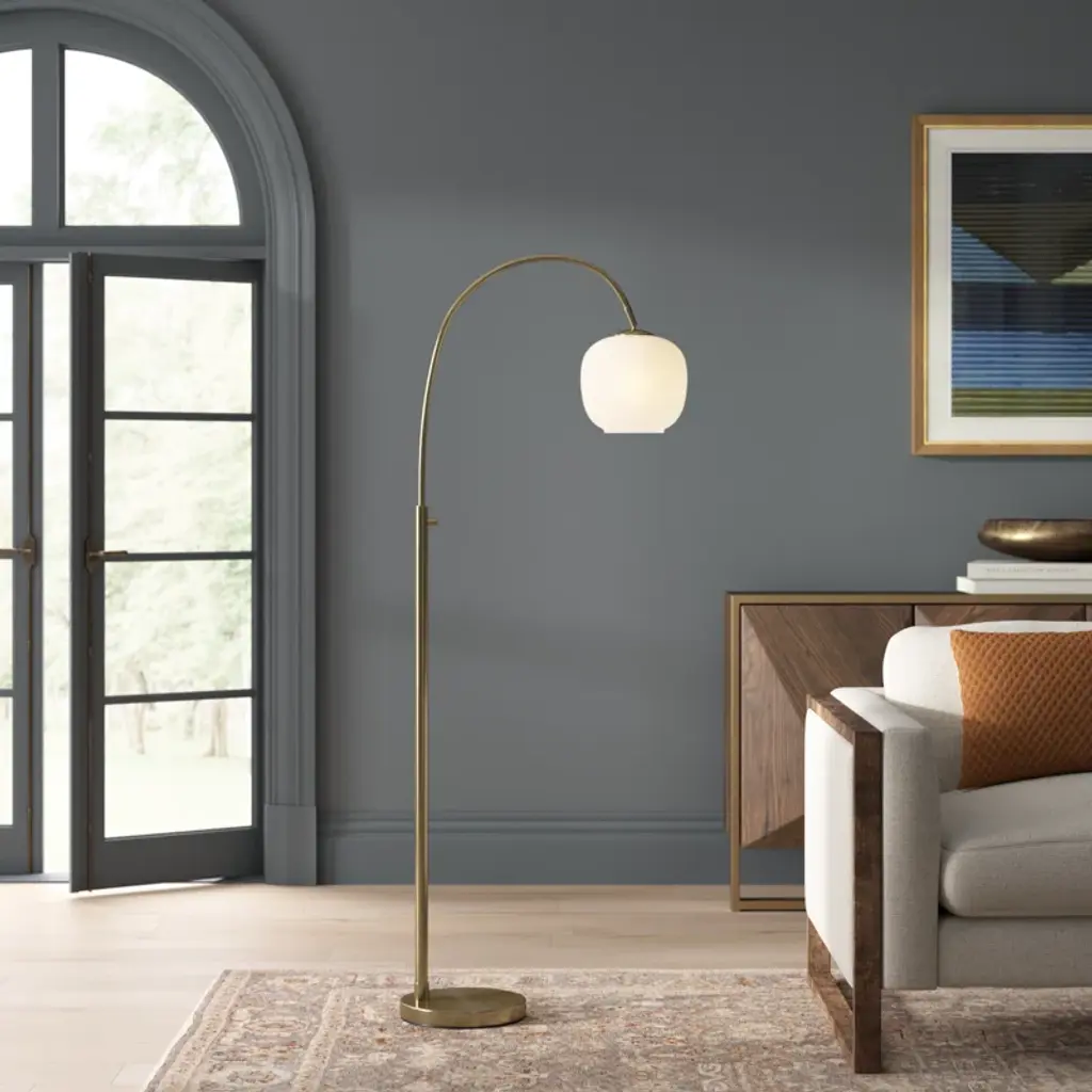 Introducing the Tahira floor lamp, a graceful and versatile lighting fixture that seamlessly marries classic aesthetics with modern functionality. This floor lamp features a Brass finish that infuses timeless charm and sophistication into your decor. Its glass shade is a study in contrast, with a glossy white exterior for a contemporary twist, while the frosted interior diffuses a soft and inviting glow. The Tahira floor lamp stands tall at 61.75 inches, making it a striking addition to any room. With its arched arm and an easy-to-use on/off rotary switch on the tube, this floor lamp provides both style and illumination for your living space. Designed for effortless integration into your decor, this floor lamp offers a touch of nostalgia and refinement while providing focused and adjustable illumination. The Tahira floor lamp is a sophisticated choice for enhancing the ambiance and visual appeal of your interior.