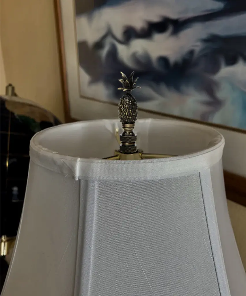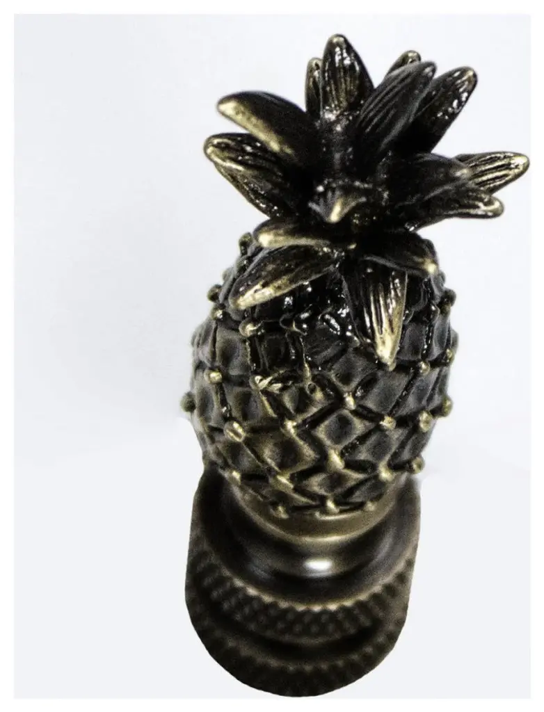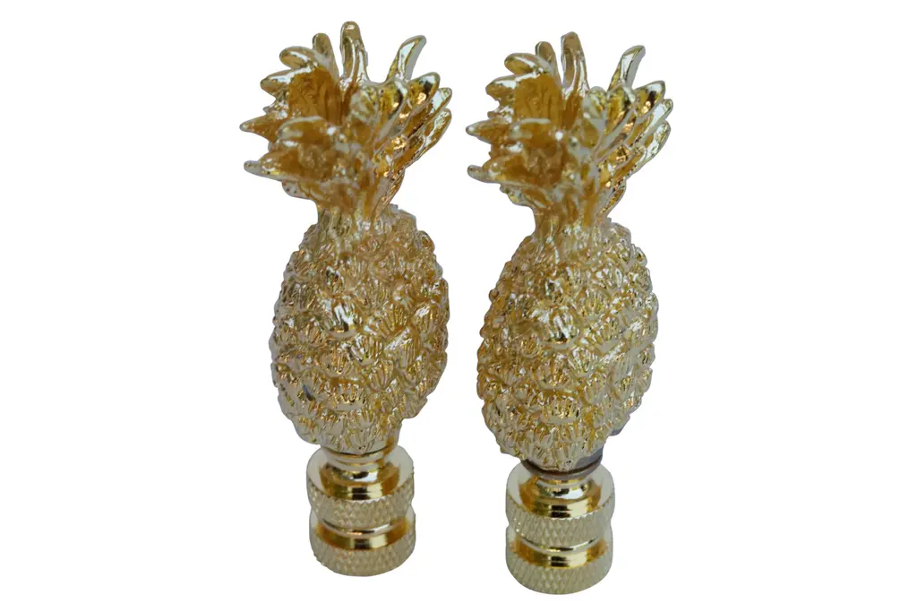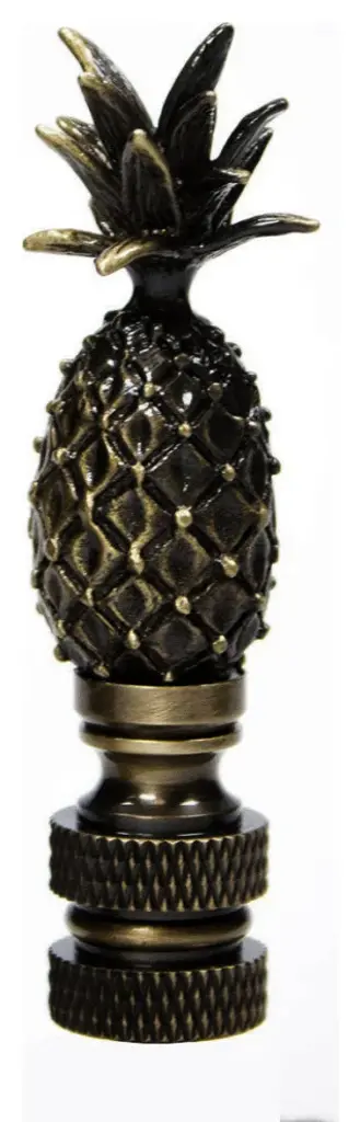A new tropical lamp finial is the perfect way to complete your new or favorite lamp. Quality finial that is sure to dress up your tired lamp. Finials have a standard 1/4"-27 thread, which will fit the harp on almost every lamp. (This means the opening is 1/4" wide and there are 27 threads per inch.) 95% of all lamp harps will fit this finial. Finial measures 2" height and 7/8" width. Material: Antiqued Metal finish with Antiqued Metal Base.Pineapple SHAPE - 1.25" width Pineapple lamp finial. A perfect tropical delight to top off your table or floor lamp.Antiqued Metal FINISH - Antiqued Metal finish will match most lamp harps.PERFECT SIZE - Proportional sized to fit most standard table or floor lamps. Finial measures 2" Height and 7/8" width. Threaded at 1/4" wide opening, threaded for standard 27 threads per inch.FUNCTIONAL - Secures your lampshade to standard table or floor lamp.EASY TO USE - Easily screws on/off. Fits standard lamp harps that measure 1/4" wide with 27 threads per inch.