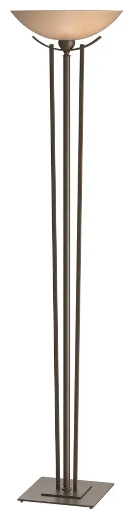 Taking a cue from the tall ornamental stands for candlesticks from long ago, our Torchiere rises to the height of elegance with two rods of steel escorting the steel tube up to the glass bowl.Bulbs Included: YesBulb Wattage: 150Type of Bulb: A-19 E26 medium Replaceable LEDNumber of Bulbs: 1Torchiere floor lamp with 20" diameter bell glass options. Foot dimmer included. 9 watt JA8 compliant LED bulb included for CA Title 20 compliance.All Hubbardton Forge products are hand-crafted to last one at a time in Vermont and backed by a Lifetime Limited Warranty.