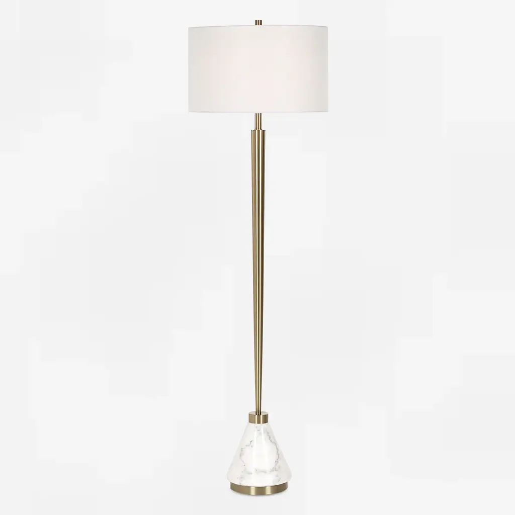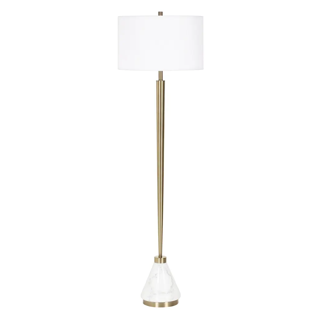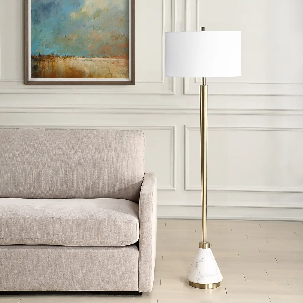 Transform your decor with the sleek sophistication of this Curran tapered floor lamp, designed by David Frisch. Features a gracefully tapered plated brass metal body anchored by a substantial white marble base for a striking contrast. Topped with a crisp white linen drum shade, it delivers both style and functionality. This lamp is a timeless addition to any modern or transitional space. Product Features: White and brass floor lamp Showcases a tapered body with a marble base Brass plated accent Includes a white round hardback drum shade Lamp uses (1) 150-watt TYPE A bulb - not included Socket type: 3-way UL listed for indoor use Dimensions: Overall: 64" high x 19" diameter Shade dimensions: 11" high x 19" diameter Material(s): metal/marble/fabric
