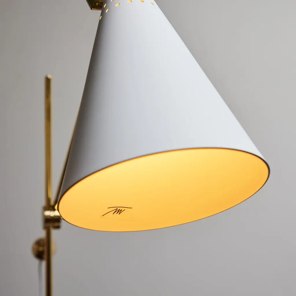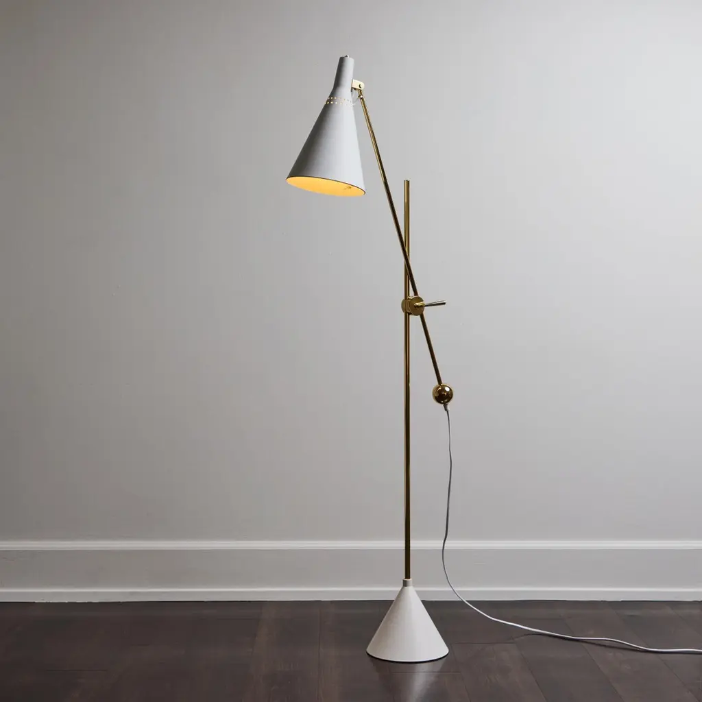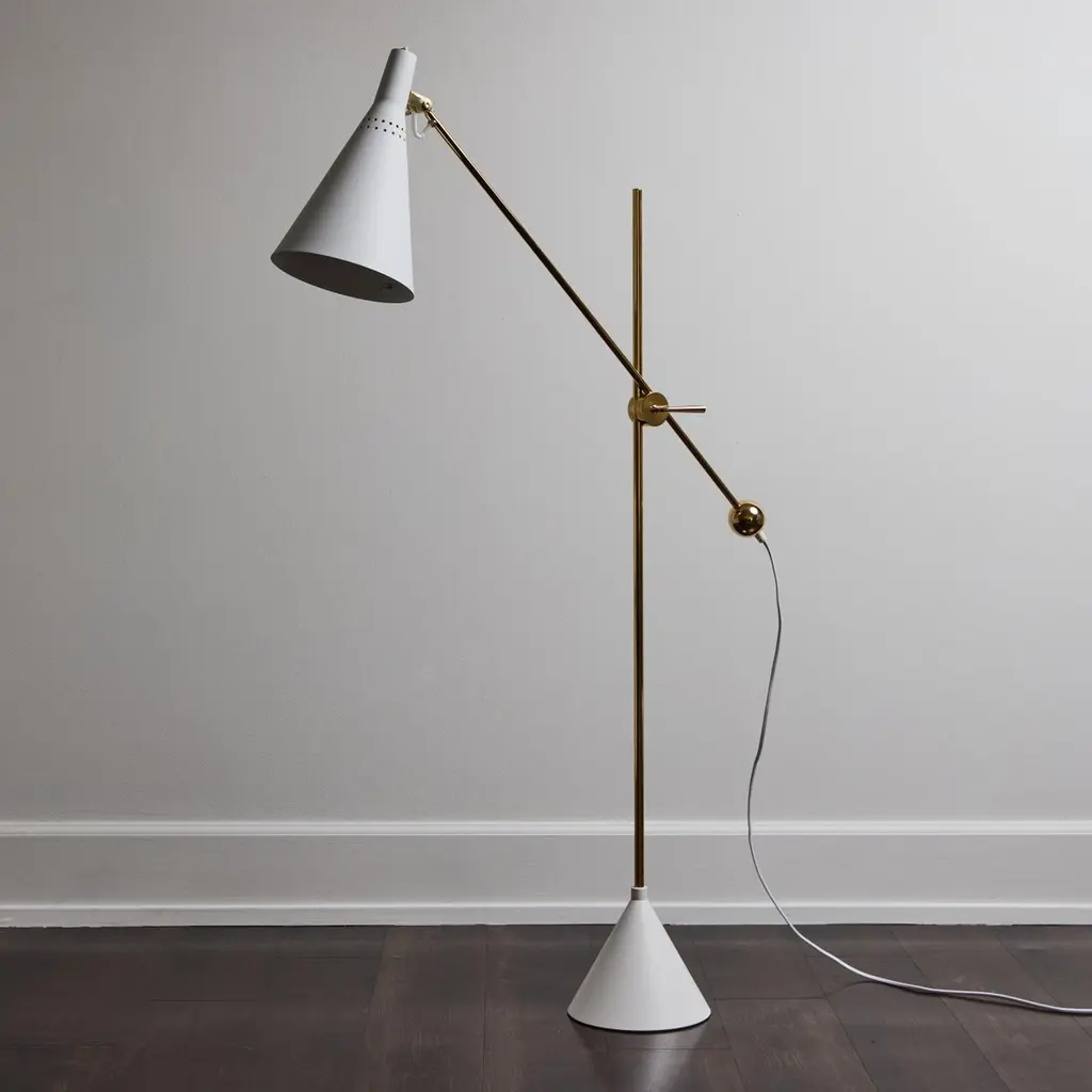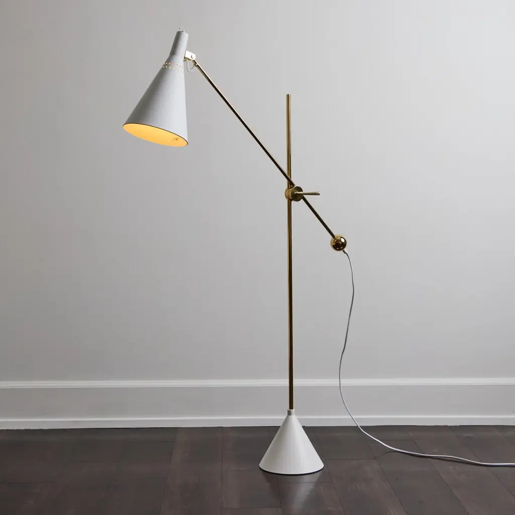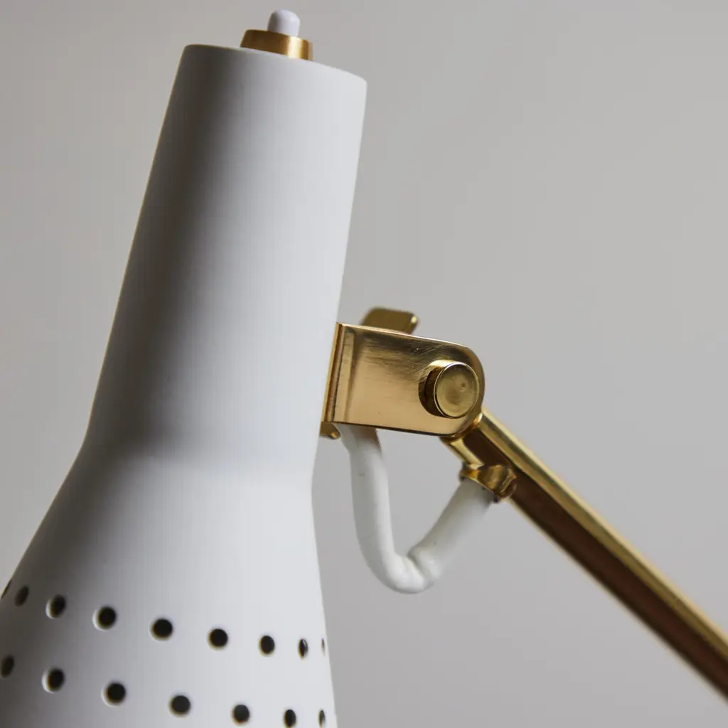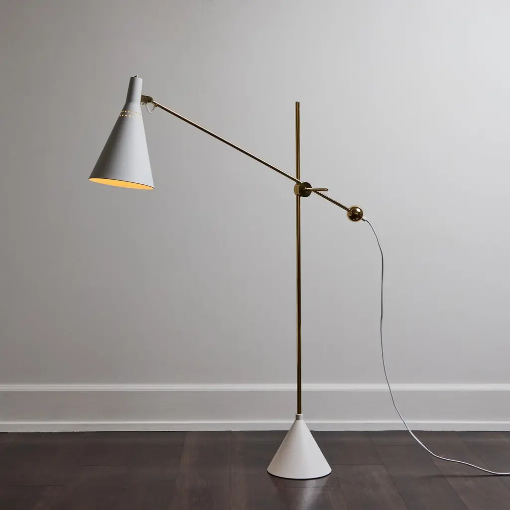 Tapio Wirkkala 'Crane' Articulating Floor Lamp in White for Innolux Oy. Originally produced as the in the 1950s as the Model #K-10-11 by Idman, this newly authorized re-edition of the iconic lamp is made by Innolux Oy of Finland with the same scrupulous attention to detail, materials and craftsmanship as the original. Executed in polished brass and white or black painted shade. A highly adjustable lamp, the shade rotates up and down while the arm upon which it is mounted can be raised , lowered, rotated, moved forward and backwards as well as up and down the fixed brass pole, changing the height and depth dimensions accordingly. Note: height with shade positioned as pictured is 53 inches, can extend up to 61 inches tall. Width as pictured is 28 inches, can extend to a max of 36 inches wide. Base diameter is 7.5 inches. Shade diameter max 6.75 inches. Shade height is 12 inches.Price is per item. 3 black and 1 white in stock. Available in unlimited quantities.Out of stock lead time 10-12 weeks or more. Please note in-stock availability subject to change. For time-sensitive orders, please contact us prior to purchasing.The internationally recognized artist Tapio Wirkkala (1915–1985) is one of the leading figures and most respected designers of the Finnish modern art industry. He was a multiple winner of the Milan Triennale, awarded the Pro Finlandia medal in 1955 and the rank of academician in 1972. Wirkkala designed several objects that have become classics, such as the Kantarelli vase, banknotes for the Bank of Finland and the Finlandia vodka bottle. The glass containers designed by Wirkkala for Iittala, such as the Ultima Thule series, have become particularly well-known. Finnish icon Tapio Wirkkala was a versatile artist, graphic designer, architect, and designer know for his sculptural and refined style. In 1960 he was awarded the Grand Prix at the Milan Triennale. His incomparable lighting pieces have become increasingly coveted by designers worldwide.Accommodates a single standard medium base e27 75W equivalent LED bulb. On/off switch on shade. Approximately 8 feet of white cord with period style US wall plug added. Not UL listed, but recommended UL listing possible from authorized 3rd party vendor upon request for an additional fee.