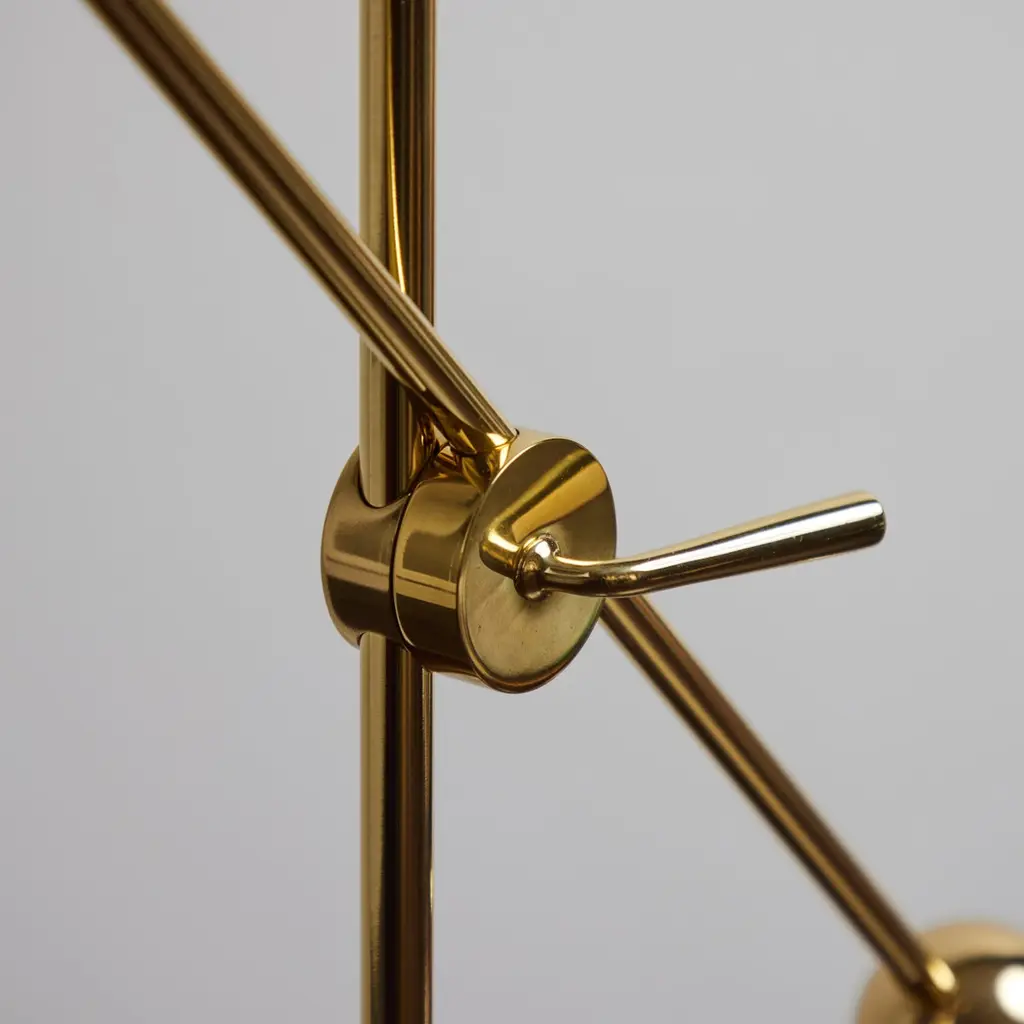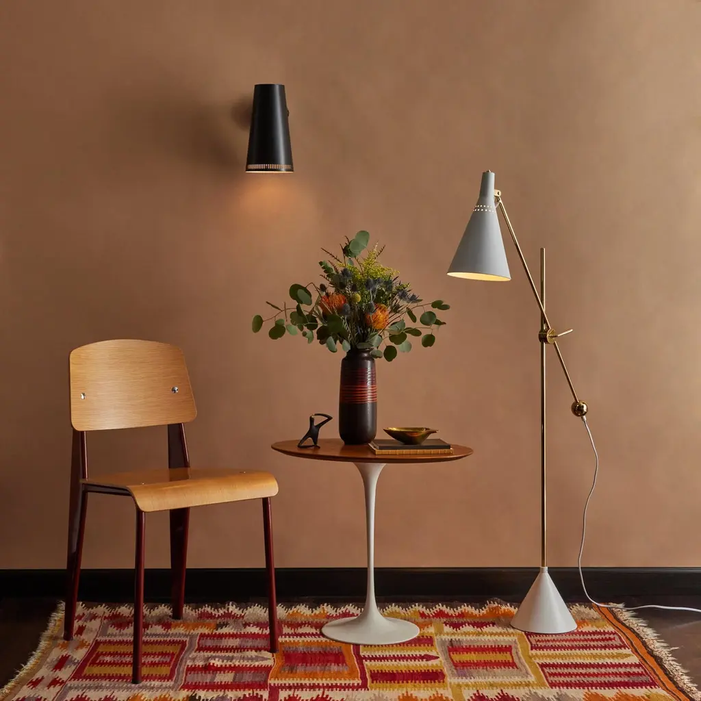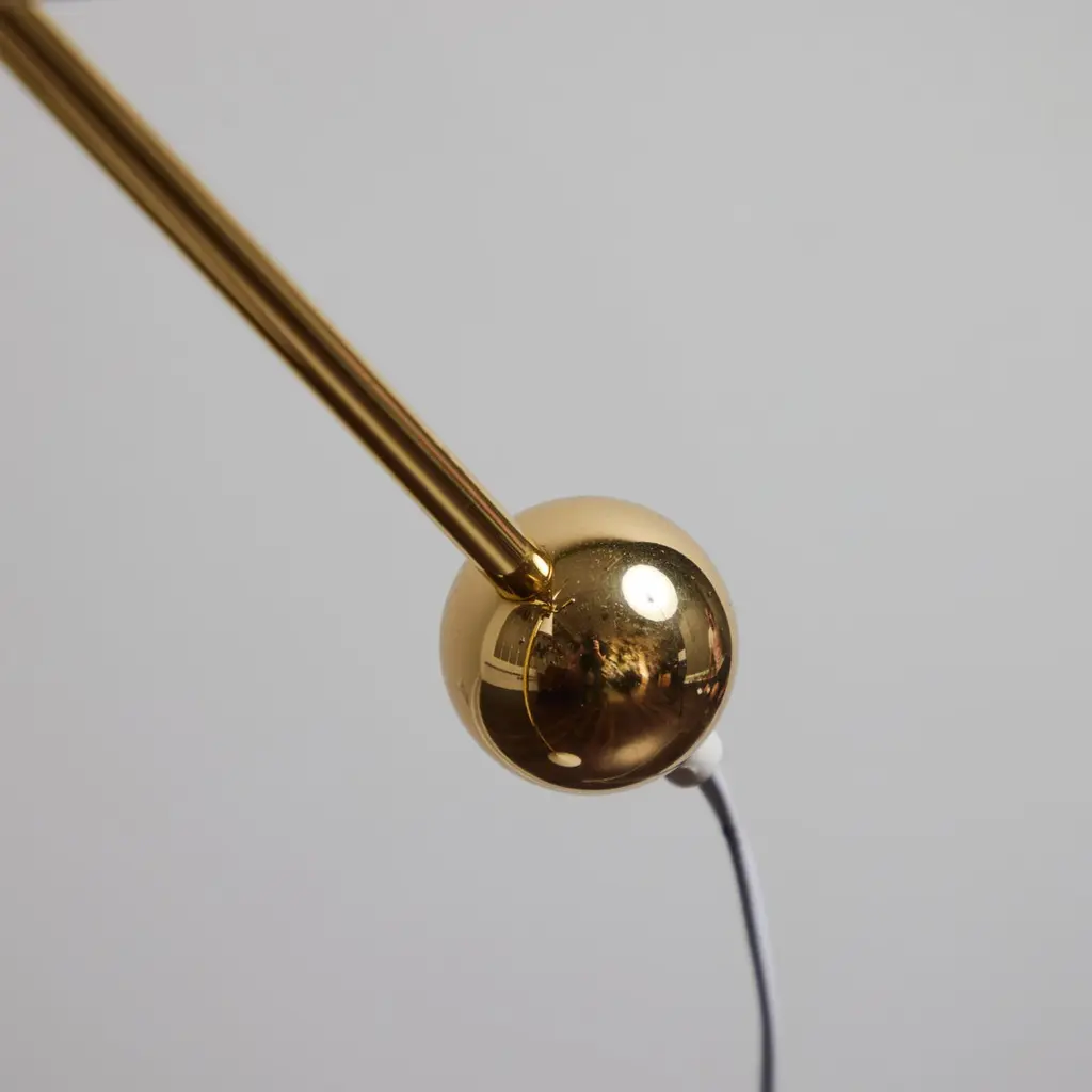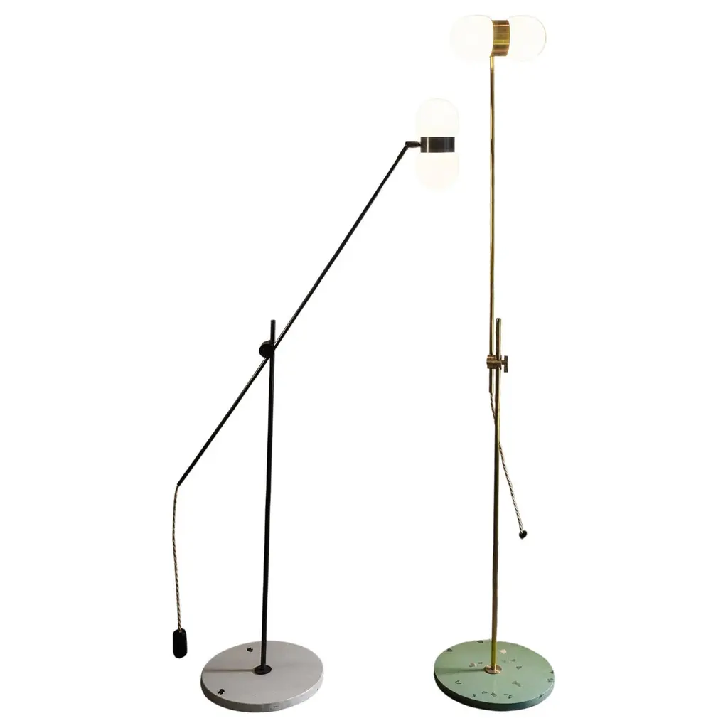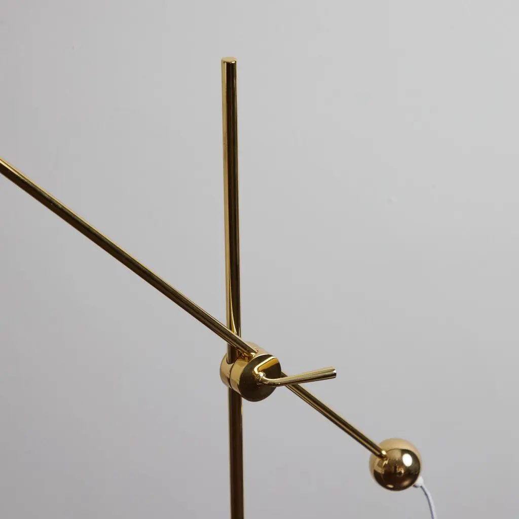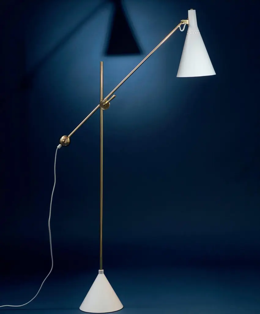 Tapio Wirkkala 'Crane' Articulating Floor Lamp in White for Innolux Oy. Originally produced as the in the 1950s as the Model #K-10-11 by Idman, this newly authorized re-edition of the iconic lamp is made by Innolux Oy of Finland with the same scrupulous attention to detail, materials and craftsmanship as the original. Executed in polished brass and white or black painted shade. A highly adjustable lamp, the shade rotates up and down while the arm upon which it is mounted can be raised , lowered, rotated, moved forward and backwards as well as up and down the fixed brass pole, changing the height and depth dimensions accordingly. Note: height with shade positioned as pictured is 53 inches, can extend up to 61 inches tall. Width as pictured is 28 inches, can extend to a max of 36 inches wide. Base diameter is 7.5 inches. Shade diameter max 6.75 inches. Shade height is 12 inches.Price is per item. 3 black and 1 white in stock. Available in unlimited quantities.Out of stock lead time 10-12 weeks or more. Please note in-stock availability subject to change. For time-sensitive orders, please contact us prior to purchasing.The internationally recognized artist Tapio Wirkkala (1915–1985) is one of the leading figures and most respected designers of the Finnish modern art industry. He was a multiple winner of the Milan Triennale, awarded the Pro Finlandia medal in 1955 and the rank of academician in 1972. Wirkkala designed several objects that have become classics, such as the Kantarelli vase, banknotes for the Bank of Finland and the Finlandia vodka bottle. The glass containers designed by Wirkkala for Iittala, such as the Ultima Thule series, have become particularly well-known. Finnish icon Tapio Wirkkala was a versatile artist, graphic designer, architect, and designer know for his sculptural and refined style. In 1960 he was awarded the Grand Prix at the Milan Triennale. His incomparable lighting pieces have become increasingly coveted by designers worldwide.Accommodates a single standard medium base e27 75W equivalent LED bulb. On/off switch on shade. Approximately 8 feet of white cord with period style US wall plug added. Not UL listed, but recommended UL listing possible from authorized 3rd party vendor upon request for an additional fee.