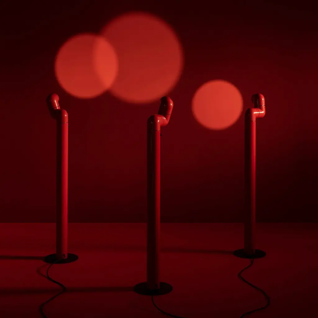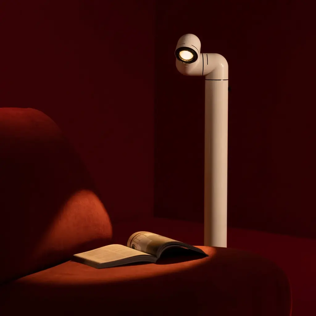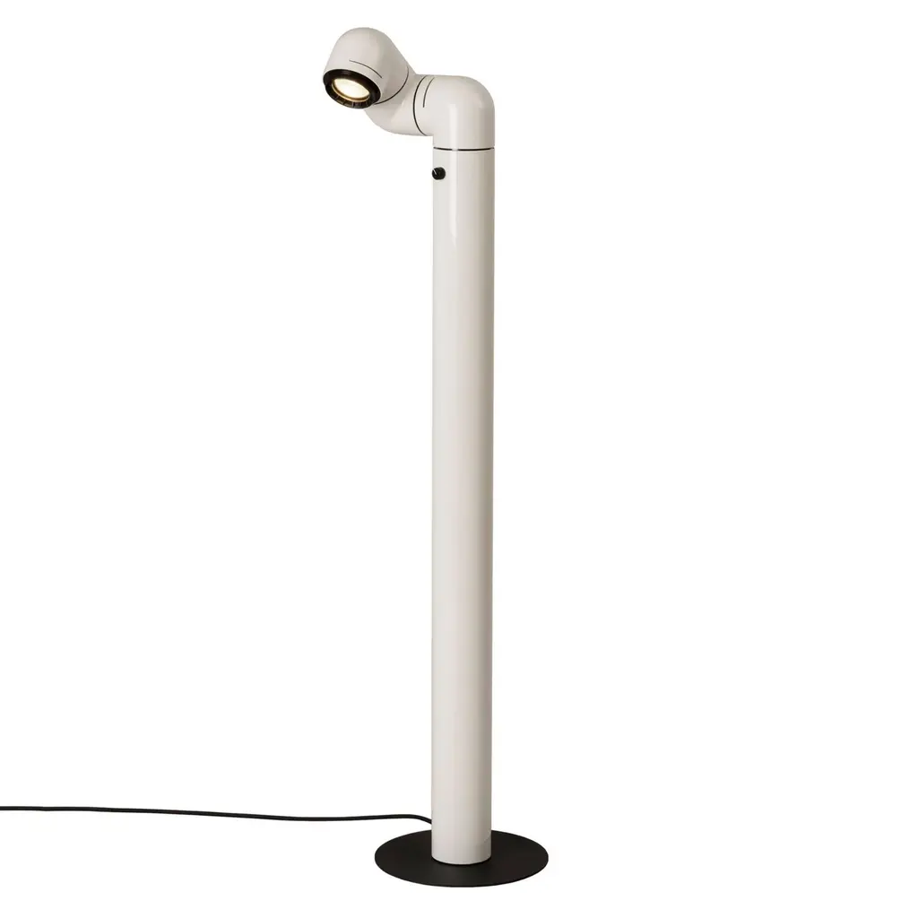 A beacon of '60s style, Santa & Cole finds a new groove with an updated floor lamp version of Tatu. André Ricard's design inspired by the curling shape of its namesake armadillo features 3 sections that rotate independently to direct light wherever it is desired and a moveable converging lens for adjusting the beam's focal length. In high-gloss red or white ABS plastic, the lamp has a built-in, dimmable LED for tweaking the illumination's intensity, making it a perfect partner to a reading chair.