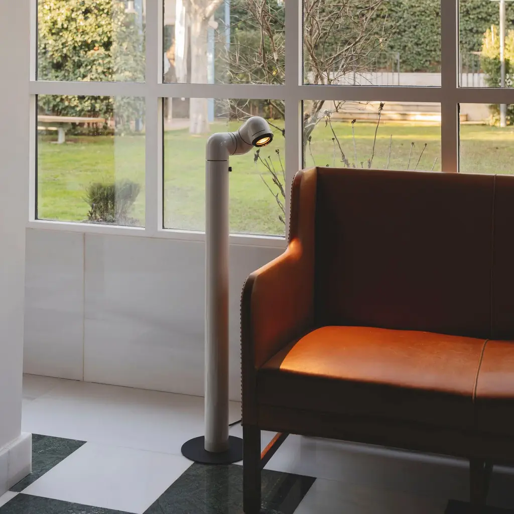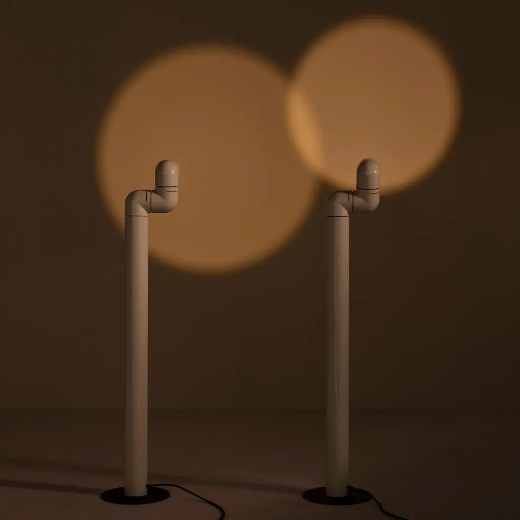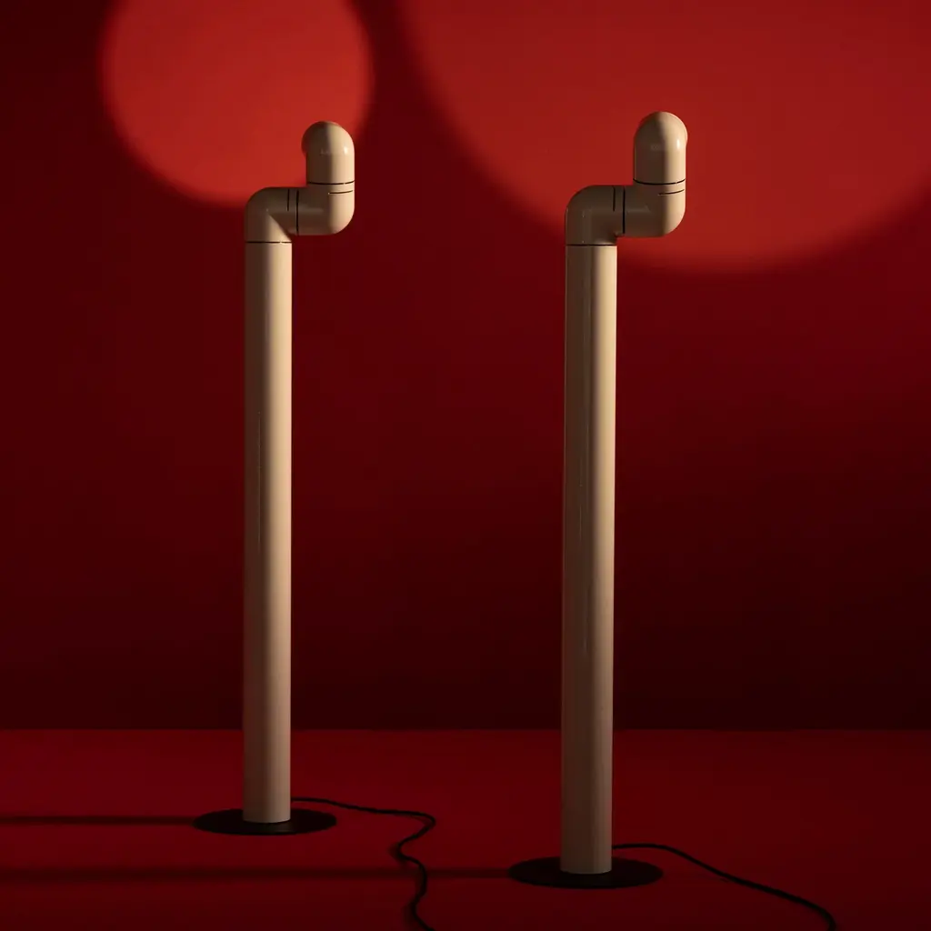 A beacon of '60s style, Santa & Cole finds a new groove with an updated floor lamp version of Tatu. André Ricard's design inspired by the curling shape of its namesake armadillo features 3 sections that rotate independently to direct light wherever it is desired and a moveable converging lens for adjusting the beam's focal length. In high-gloss red or white ABS plastic, the lamp has a built-in, dimmable LED for tweaking the illumination's intensity, making it a perfect partner to a reading chair.