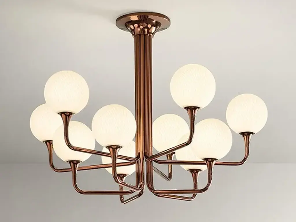 Tee PL5+5 RD 120 is a ceiling lamp with a coppered gold galvanized metal and amber Murano triplex glass with spiral decoration diffuser. Available in several variations.Technical featuresTee PL5+510×E14×15 W MAX (NOT INCL.)*USA 10×E12×40 W MAX (NOT INCL.)** BULB MAX Ø 37 MM L 70 MMCEETLCCCCB SCHEMETee is the result of the search for the meeting point between geometric rigour and class, aesthetically marked by the curved line. The luminous glass spheres, which enhance the preciousness and enhance the light, are delicately animated by an incision of parallel spiral lines, a delicate decoration that seems to give the globes a slow rotation, like a dance made up of signs of light. Tubular metal stems with a round cross-section, with coppered gold galvanic finishing, at the end of which a truncated metal cone holds a sphere. An organic shape recalling the delicacy of the calla lily flower, alone or in bunches, depending on the type of Tee, which varies from suspended ceiling lights to floor, table, wall and ground versions. The aim was to create a family that is extremely flexible in the way it can be used and modular in its configurations, so that it can meet the lighting needs of any architectural space. Architectural space. Traditional lighting.
