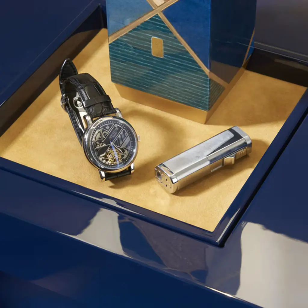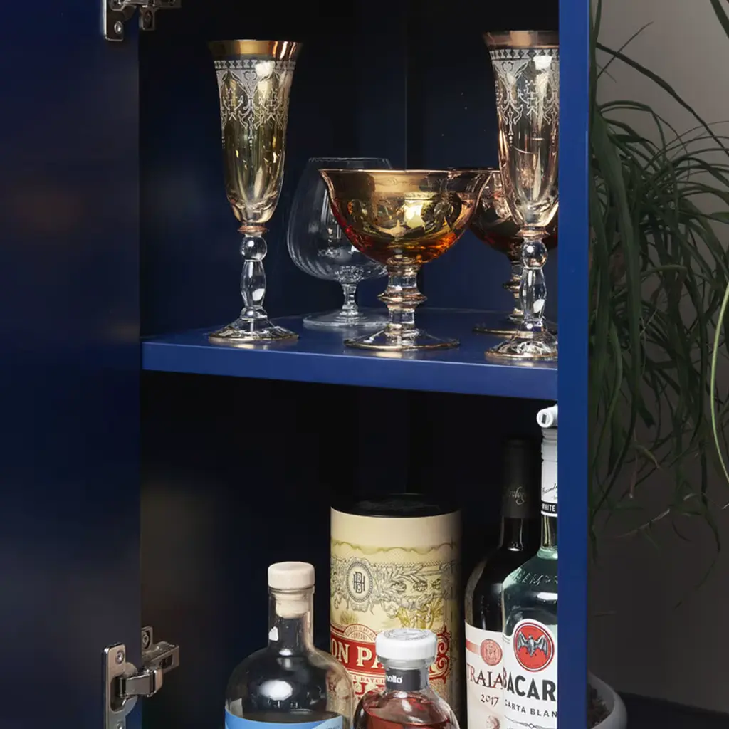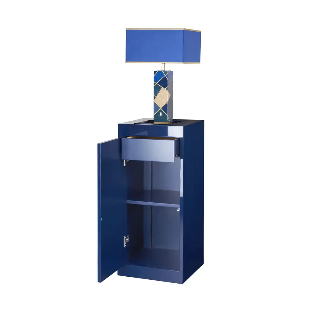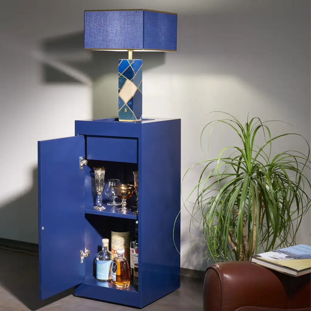 This eye-catching touch floor lamp was designed to maximize style and functionality. Topped by a stunning lamp flaunting superb geometric inlays, the glossy blue-lacquered body features an integrated vide-poche covered in Alcantara at the top, while offering plenty of storage space within for bottles and glasses. Equipped with spherical wheels, it can be easily repositioned. Light is dimmable.