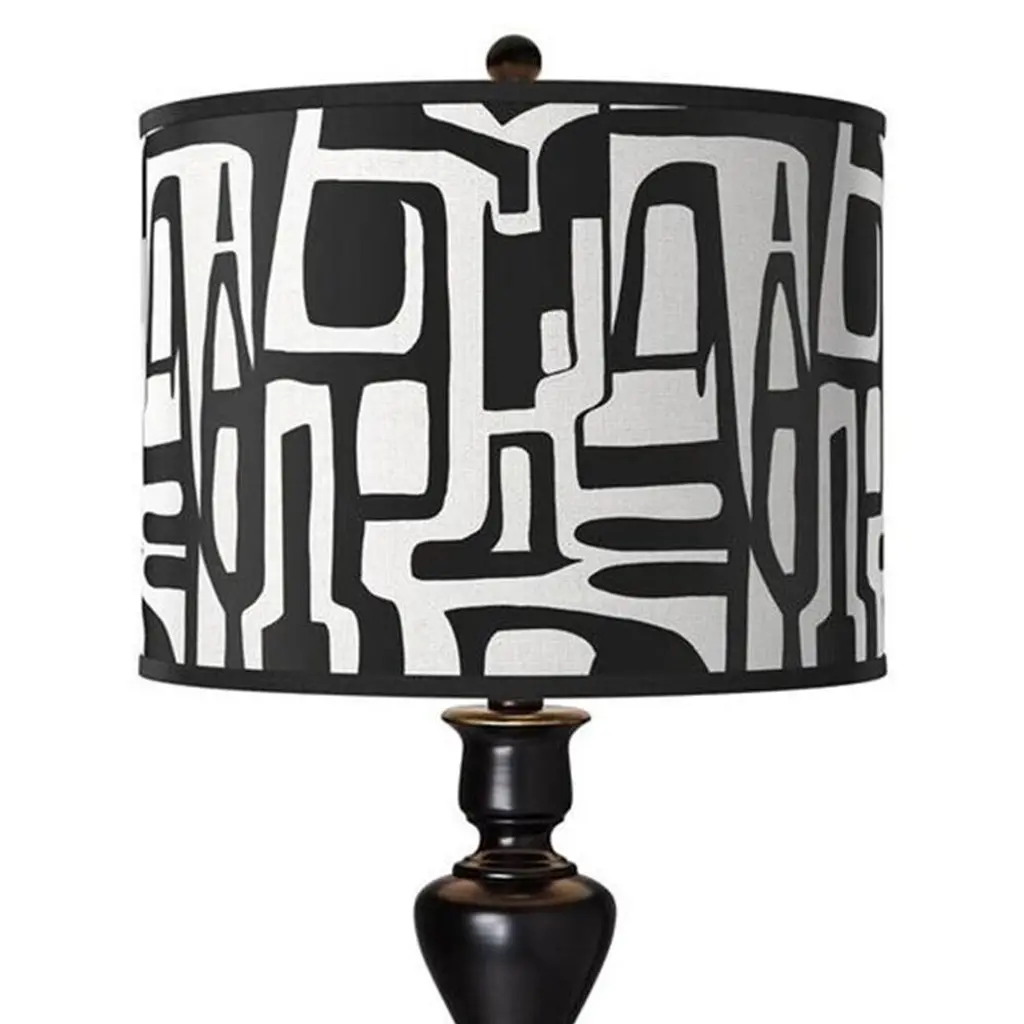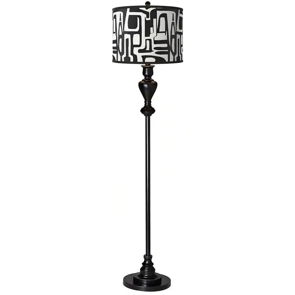 PRODUCT DETAILS: Overall: 58" high. Shade is 13" wide x 10" high. Base is 10" wide. Takes one maximum 150 watt bulb (not included). Stylish floor perfect for living rooms, family rooms, and more. Black bronze finish with soft gold edging. Metal construction. Custom-printed giclee lamp shade with Tempo pattern. DESCRIPTION: Add a stylish and unique accent to your living space with this shapely floor lamp which is topped off with our patented Tempo pattern giclee shade. Warm light shines through illuminating the pattern and creating a truly distinctive look.