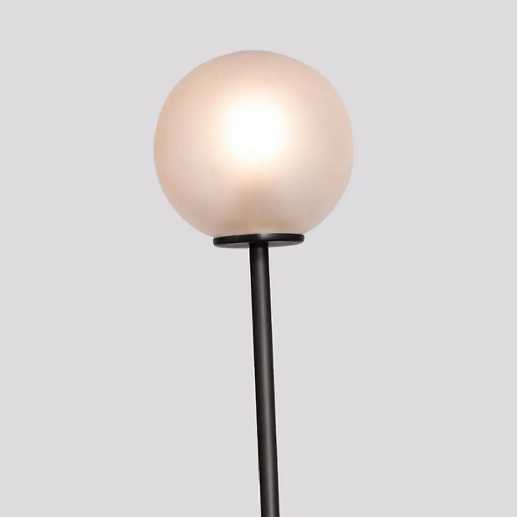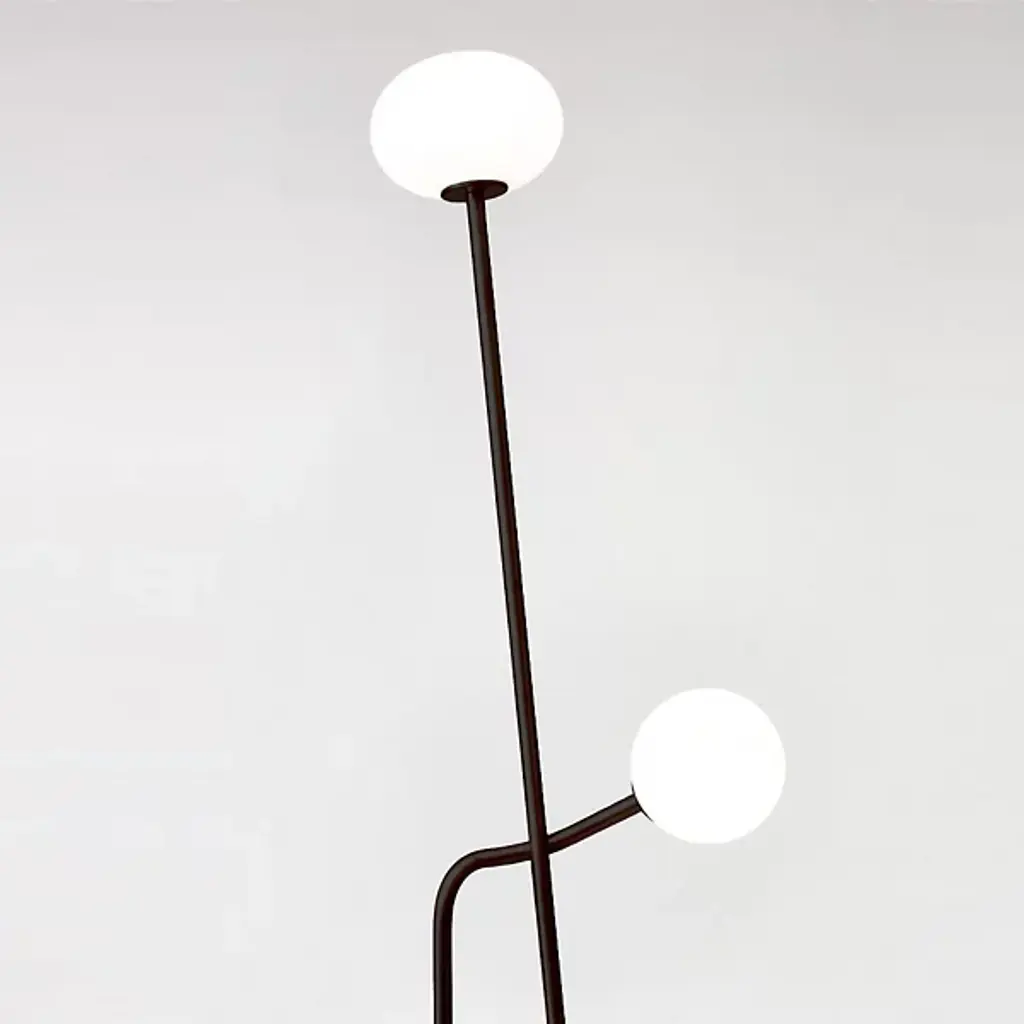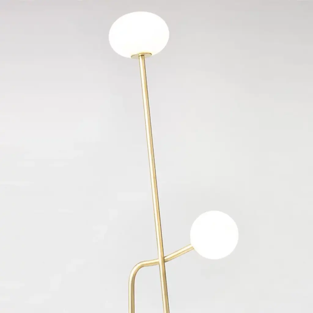 The Tempo Floor Lamp by ATELIER de TROUPE lends a graceful touch to modern décor. Crafted from brass, this minimalistic fixture presents two slender stems that extend over six feet as they lean toward each other. The shorter stem softly curves to traverse the second, affectionately supporting it while creating an expressive, yet simple form. Handblown glass spheres contain integrated LEDs, glowing warmly to illuminate the surrounding area with soothing light.