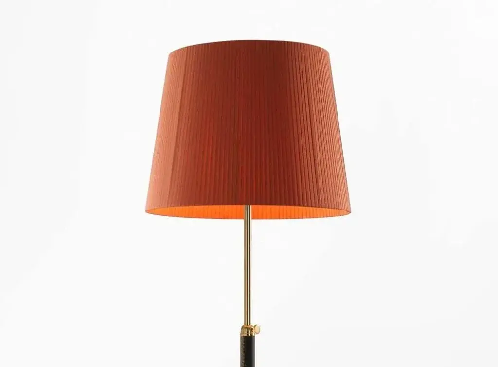 Terracotta and brass pie de salón g3 floor lamp by jaume sans dimensions: d 40 x h 120-160 cm materials: metal, leather, ribbon. Available in chrome-plated or polished brass structure. Available in other shade colors and sizes. This slender synthesis of traditional lamps is a sparkle of timeless elegance created in a context of the avant-garde. The combination of materials with its symmetrical, leather-wrapped centre shaft, its choice of three shade materials and eight colour options make it a paradigm of industrial craftsmanship. Height adjustable lampshade. Dimmer included. this piece is attributed to the mentioned designer/maker. It has no attribution mark and no official proof of authenticity, however it is well documented in design history. I take full responsibility for any authenticity issues arising from misattribution, up to 250v (europe/uk standard).