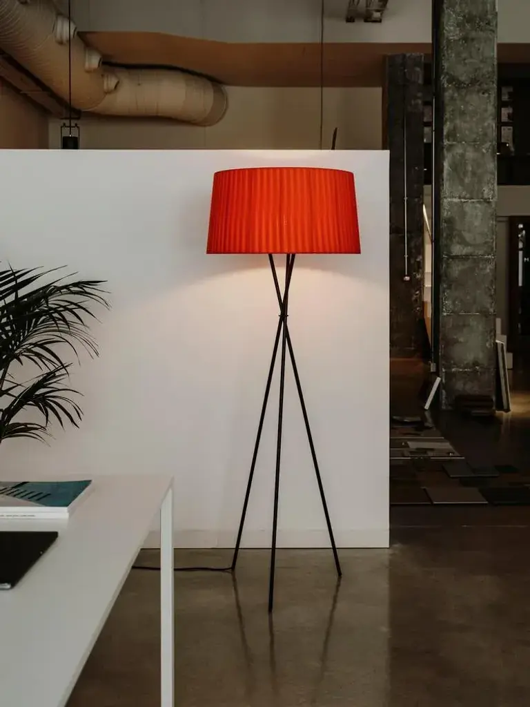 Terracotta trípode g5 floor lamp by santa & cole dimensions: d 62 x h 168 cm materials: metal, ribbon. Available in other colors. Trípode humanises neutral spaces with its colourful and functional sobriety. The shade is hand ribboned and its base could not be more stable. Switched on, it provides a characteristic, warm light, rich in nuances. Switched off, it is a small volumetric sculpture that invites immediate use. Dimmer included. this piece is attributed to the mentioned designer/maker. It has no attribution mark and no official proof of authenticity, however it is well documented in design history. I take full responsibility for any authenticity issues arising from misattribution, up to 250v (europe/uk standard).
