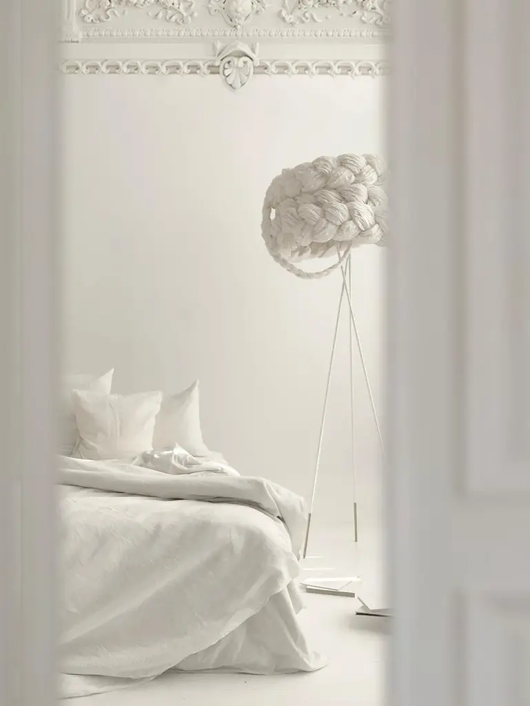 The Bride Large White Floor Lamp by MammalampaUnique Piece.Designed by Ieva Kalēja.Dimensions: Ø 80 x H 190 cm.Materials: Paper, brass, and painted steel.Available in different sizes and colors. Please contact us. All our lamps can be wired according to each country. If sold to the USA it will be wired for the USA for instance.The Bride’s “dress” is created from paper presenting this traditional lamp material in an unusual solution. As light shines through the paper, you will find yourself infused by an aura of airy lightness; almost as if the lamp were not subject to the law of gravity. This is most definitely a lamp with a gender - the atmosphere created by The Bride is truly feminine. Entirely handmade, each Bride has her personality characterized by the unique pattern in which her shade is woven with the personal touch of the weaver who created the pattern. No two Brides on earth are the same!The collection comprises ceiling lamps in two sizes and a kindred floor lamp and table lamp. MammalampaOne day we got tired from all the produced, artificial, and expected and we decided to start non-production. Finding something that has created itself and made it shine. Seeing the rough, natural beauty of the material and awakening it to a new life. This search for a new aesthetic is fulfilled by the core of the company - members of one family. Our company name is "Mammalampa" and it fully expresses the products and us, who create these products. This capacious name includes our value system. "Mamma" (mom) brings together both our philosophy - back to the roots, the real, non-produced, and the fact that the feminine approach dominates in the lamp design. "Mammalampa" lamps are created from natural materials and with minimal technological means, primarily through manual labor, primitive material processing, or even untreated materials. We want to go back to the genuine. "Mammalampa" is focused on the "hunger" for the fair and primeval. “Mammalampa” imagines materials in an unexpected light, creating its distinctive signature and values.