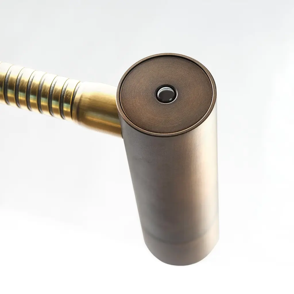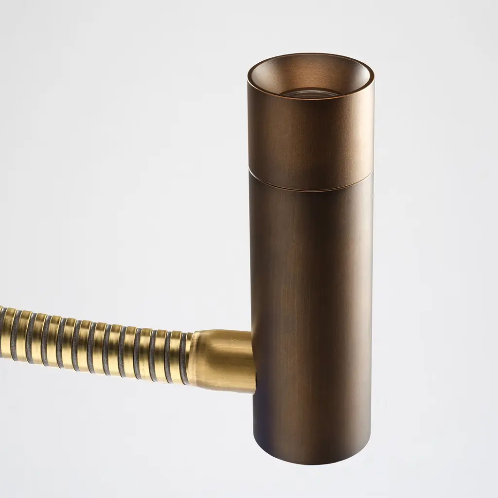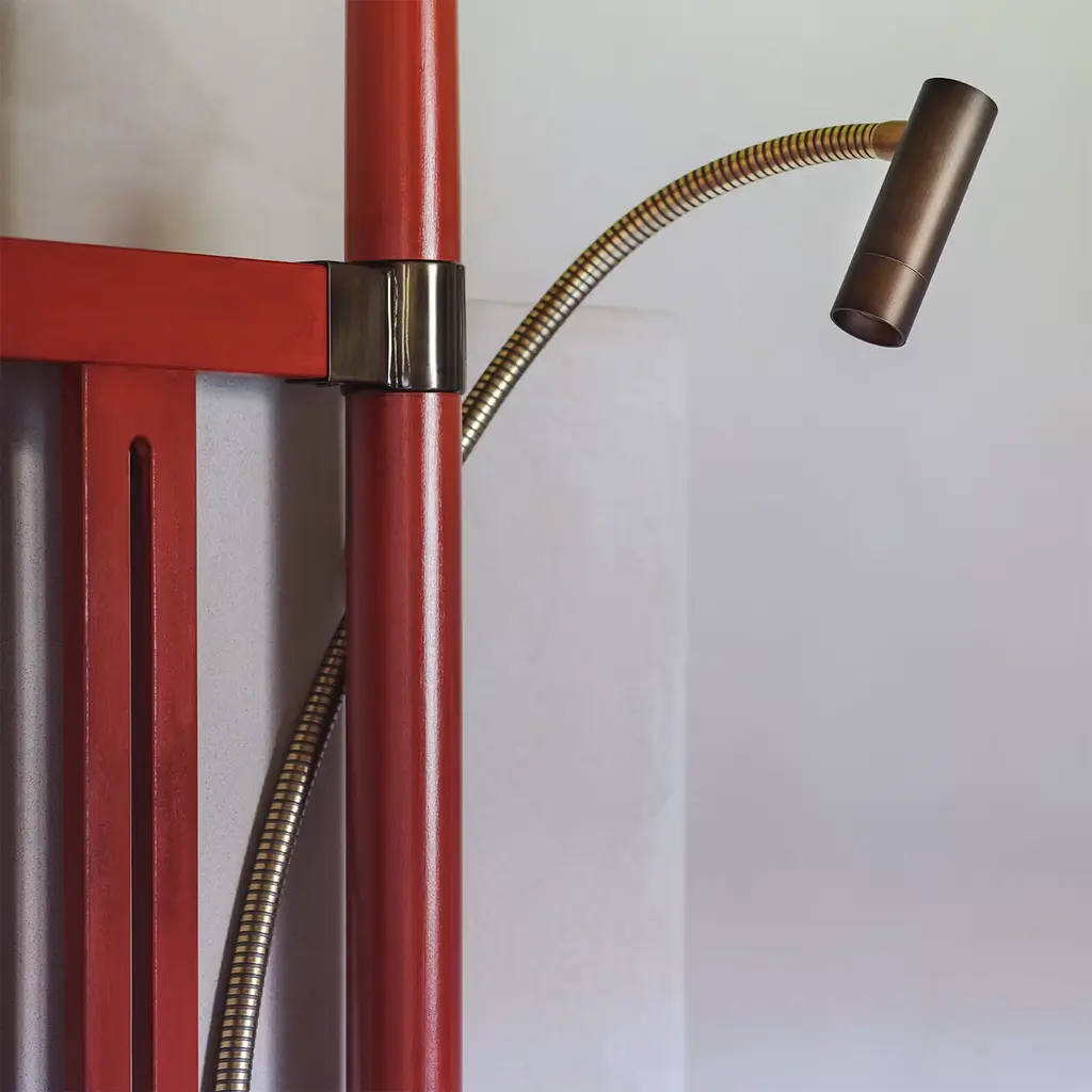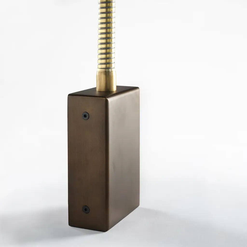 A solid brass frame conceived for a safe design distinguishes this reading lamp, its flexible stem allowing for the orientation of the LED light stream easing late-night reading sessions. Geometric elegance is stated by the cylindrical shape of the diffuser and parallelepiped-shaped base. This design was created to be installed on the wall.