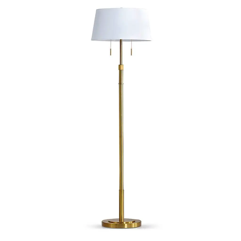 Illuminate your larger space with style and functionality using the HOMEGLAM Grande Adjustable Floor Lamp. With a height range of 55" to 66" and a choice of 18" diameter lamp shades, this lamp is perfect for any room. The lamp is built with 2 lights, each controlled by a classic pull chain on/off switch, and a strong metal construction on a 12" steady, heavy weighted base. Add value to your decor with the Grande Adjustable Floor Lamp.Features: