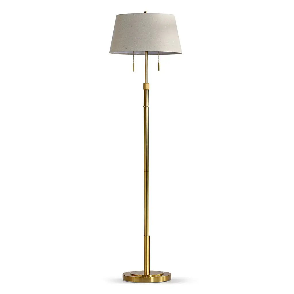 Illuminate your larger space with style and functionality using the HOMEGLAM Grande Adjustable Floor Lamp. With a height range of 55" to 66" and a choice of 18" diameter lamp shades, this lamp is perfect for any room. The lamp is built with 2 lights, each controlled by a classic pull chain on/off switch, and a strong metal construction on a 12" steady, heavy weighted base. Add value to your decor with the Grande Adjustable Floor Lamp.Features: