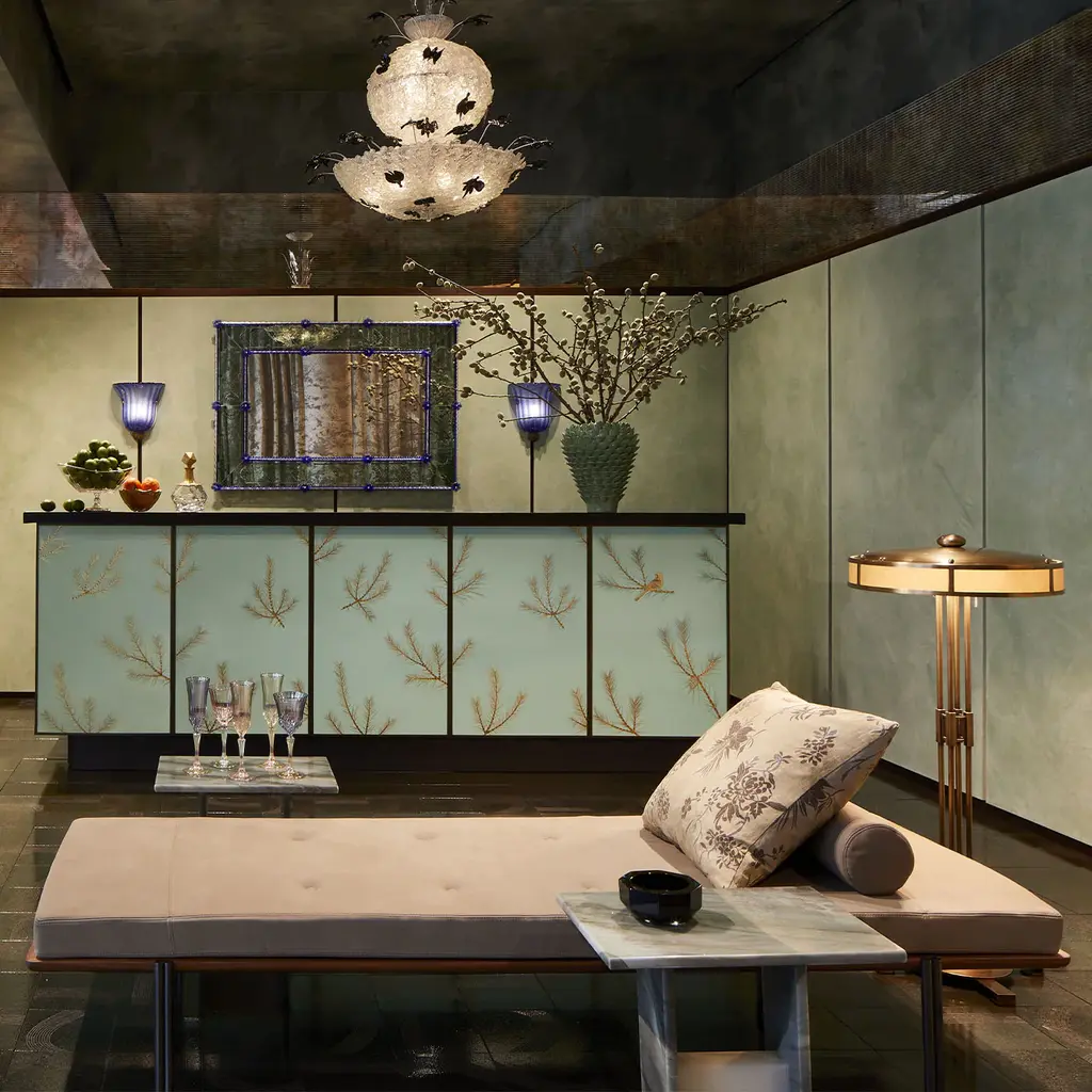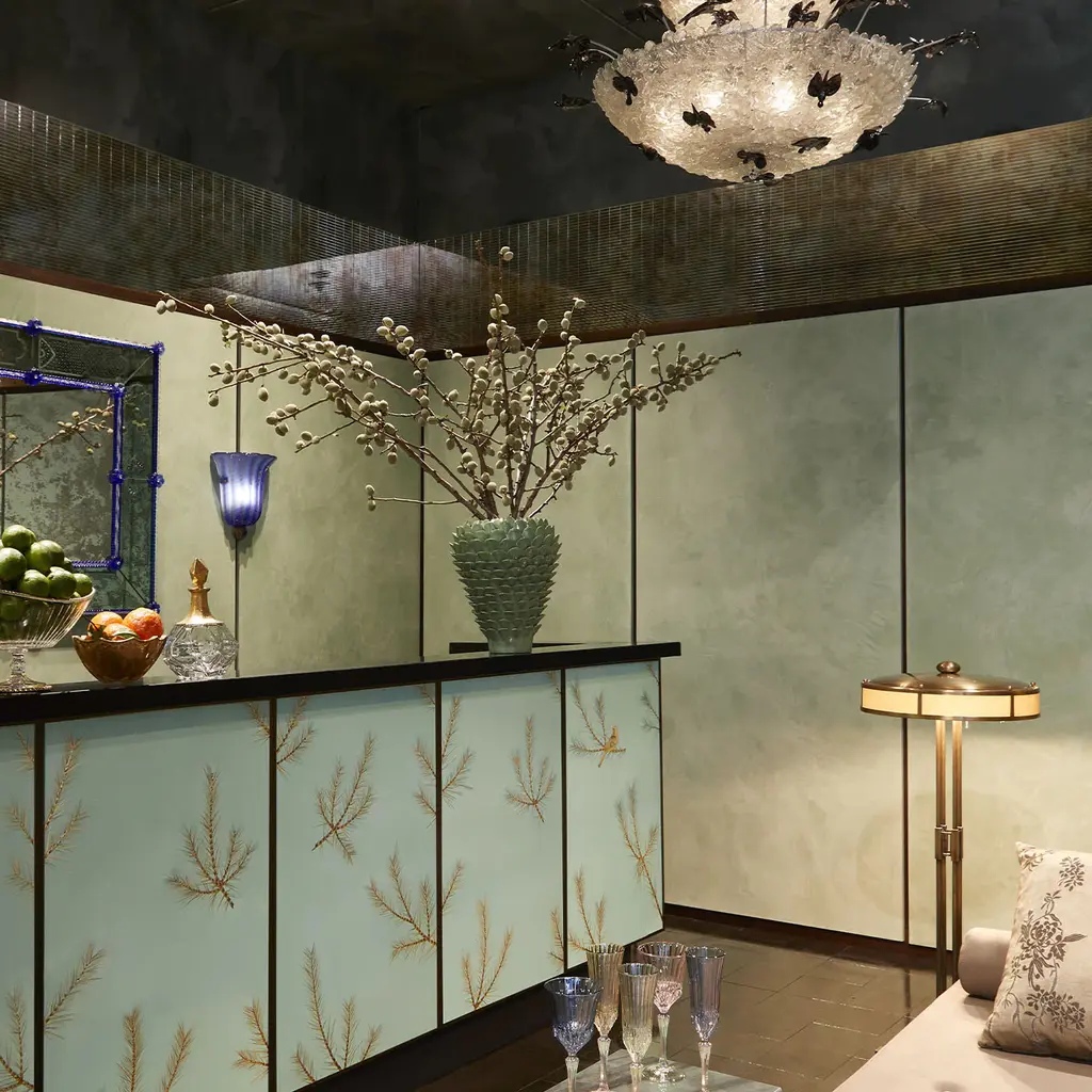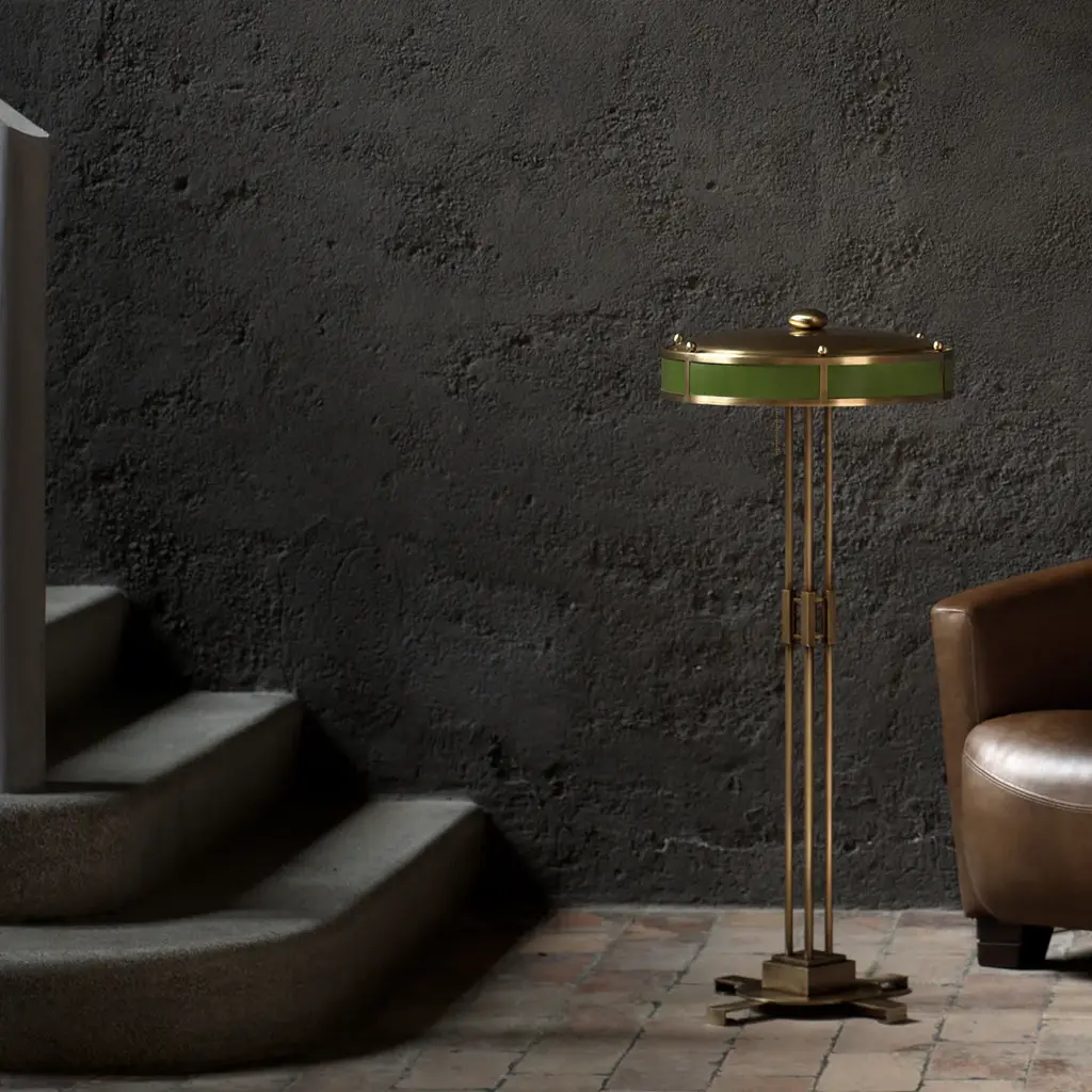 With substantial proportions with a delicate shade, this floor lamp has an allure that will bring glamour to any surroundings. Made of brass-plated steel and inspired by the Italian design of the early 1930s, four parallel tubular rods are supported by a square resting on a circular base with four L-shaped feet. The eye-catching circular lampshade has a closed design with a vibrant green faux vellum border and a globe-shaped accent on top. Available also in nickel-plated steel.