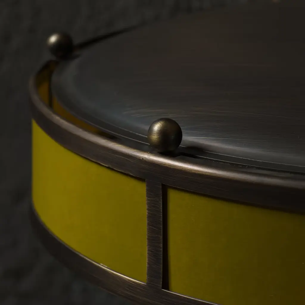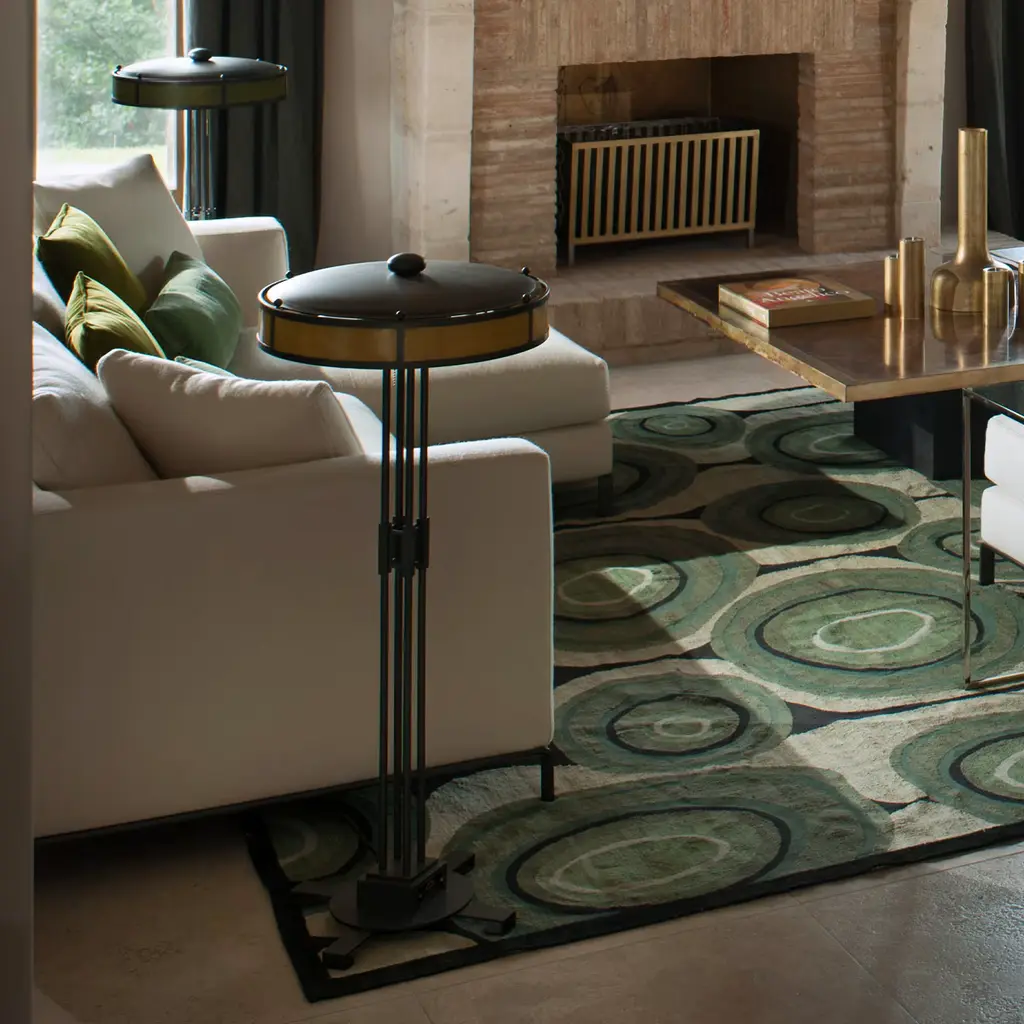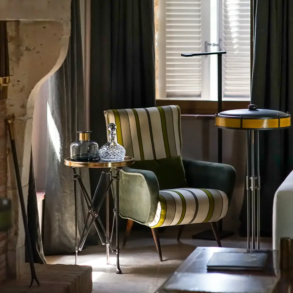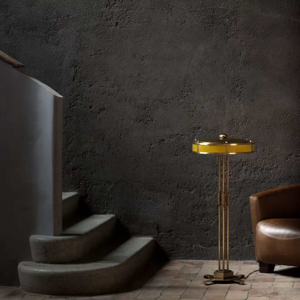 Distilling pure vintage flair, this graceful table lamp inspired by early 1930s Italian design makes for a sublime addition to classic and eclectic decors. It flaunts a streamlined steel frame plated in brass with green faux vellum inserts through which light filters. Please contact the Concierge for available color variants.