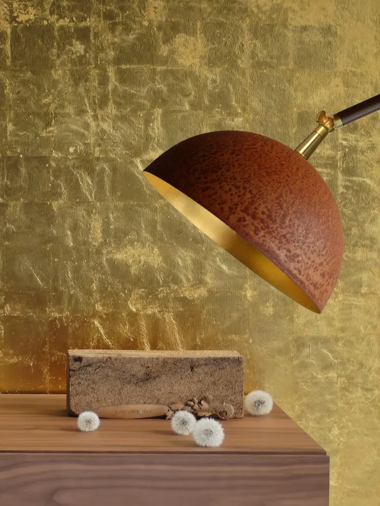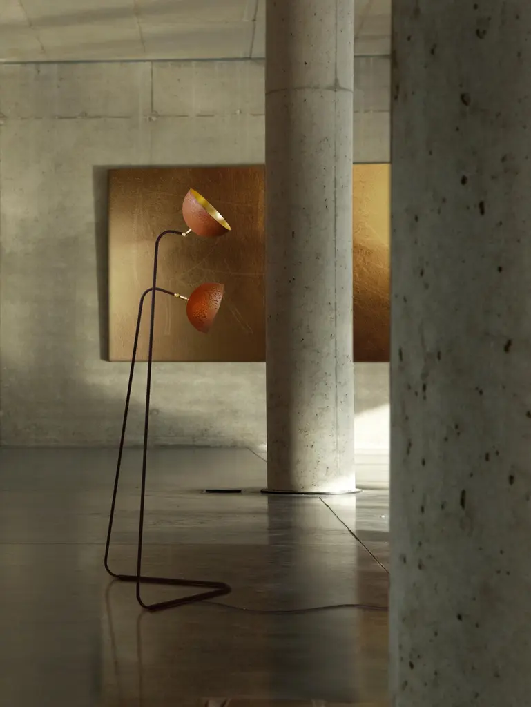 The Queen Double Floor Lamp by MammalampaUnique Piece.Designed by Ieva Kalēja.Dimensions: Ø 55 x H 148 cm.Materials: Corroding steel, painted steel, and 23.75-carat gold plate.All our lamps can be wired according to each country. If sold to the USA it will be wired for the USA for instance. Please contact us. The exterior of The Queen is made from corroding steel, while the inside of the lamp is covered with a 23.75-carat gold plate. The spherical gold-plated form creates the illusion that the entire inner surface of the sphere radiates light. Its clean lines and simplicity characterize the shape of The Queen. In turn, the ambitious combination of materials creates an imposing image.In this lamp, the most valuable face of metal meets the poorest. These two surfaces are entirely handmade; the handcraft of expert goldsmiths guarantees the queen’s golden shine, while nature draws spontaneous and unpredictable patterns on the rust. No two Queens on earth are the same! Lamps are designed and handmade exclusively by Mammalampa.MammalampaOne day we got tired from all the produced, artificial, and expected and we decided to start non-production. Finding something that has created itself and made it shine. Seeing the rough, natural beauty of the material and awakening it to a new life. This search for a new aesthetic is fulfilled by the core of the company - members of one family. Our company name is "Mammalampa" and it fully expresses the products and us, who create these products. This capacious name includes our value system. "Mamma" (mom) brings together both our philosophy - back to the roots, the real, non-produced, and the fact that the feminine approach dominates in the lamp design. "Mammalampa" lamps are created from natural materials and with minimal technological means, primarily through manual labor, primitive material processing, or even untreated materials. We want to go back to the genuine. "Mammalampa" is focused on the "hunger" for the fair and primeval. “Mammalampa” imagines materials in an unexpected light, creating its distinctive signature and values.