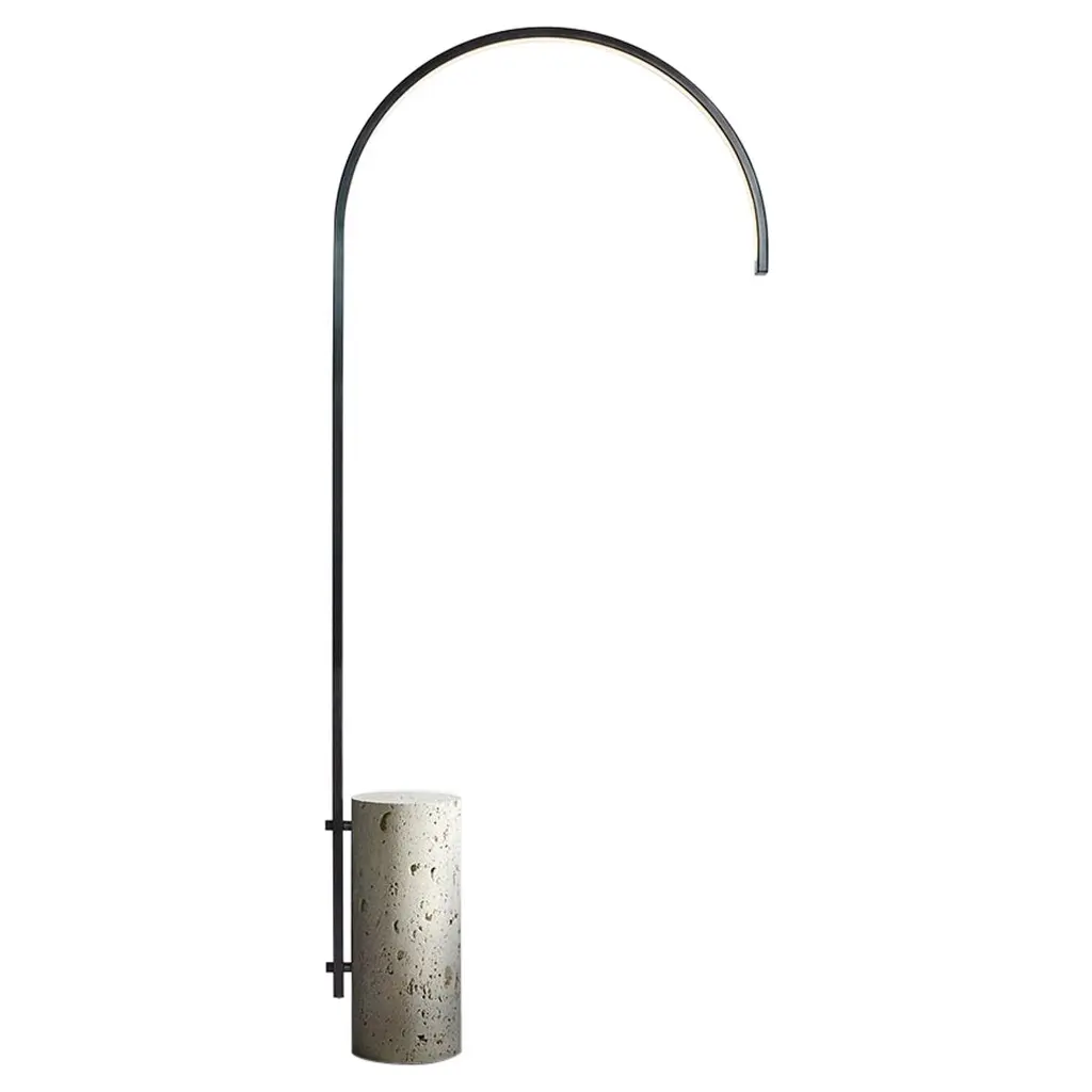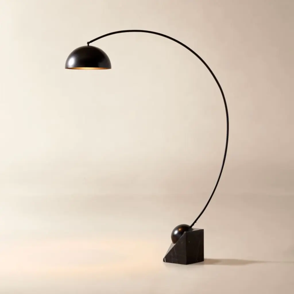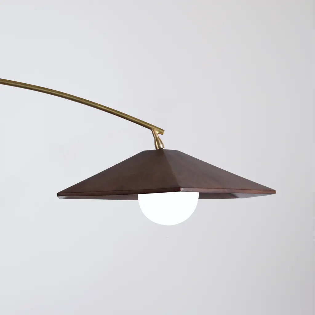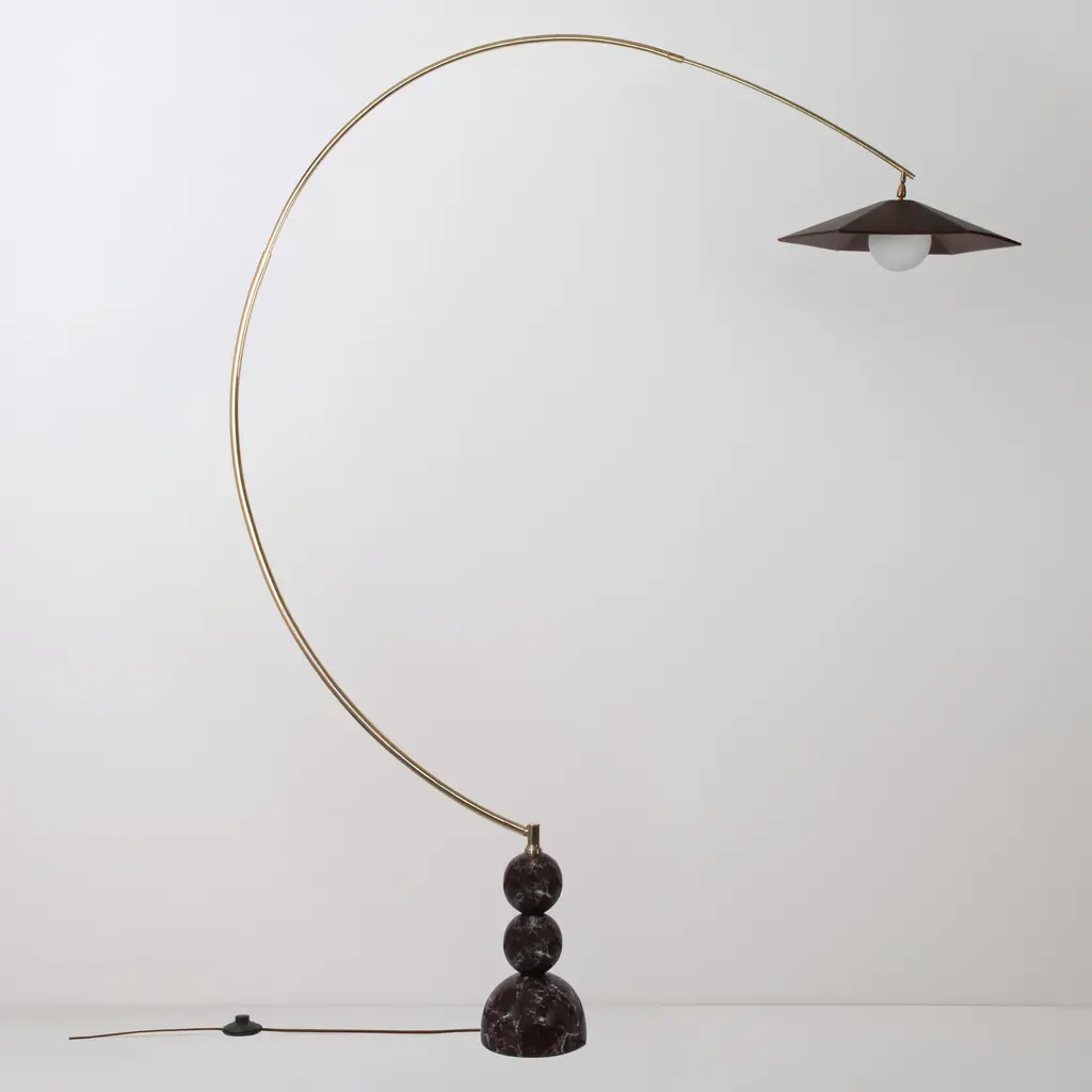 A modern statement in geometry and material, this sculptural floor lamp features a graceful arched unlacquered brass arm anchored by a tiered base of Rosso Levanto marble—a richly veined, deep burgundy stone that brings natural drama and depth. The stacked marble spheres ground the form with elegance and visual rhythm. At the apex of the arc, a hexagonal walnut shade adds warmth and texture, offering a faceted, organic counterpoint to the lamp’s metallic lines. When illuminated, it casts a soft, ambient glow that enriches any space with atmosphere and style. Thoughtfully designed to function as both lighting and sculpture, this piece brings refined presence to reading corners, lounges, or open living areas. Materials: Rosso Levanto marble base, unlacquered brass arm, solid walnut hexagonal shade Light source: E12 x 1 Features: Fabric-wrapped cord, foot switch Ideal for: Statement lighting, cozy corners, curated interiors Height 97.2 in Width/Depth 76.3 in Base Width 10.2 in