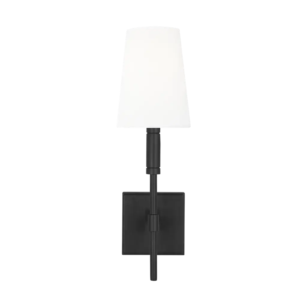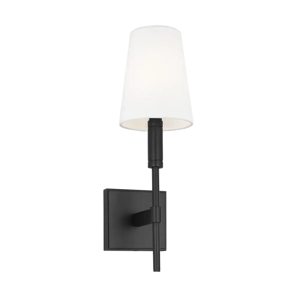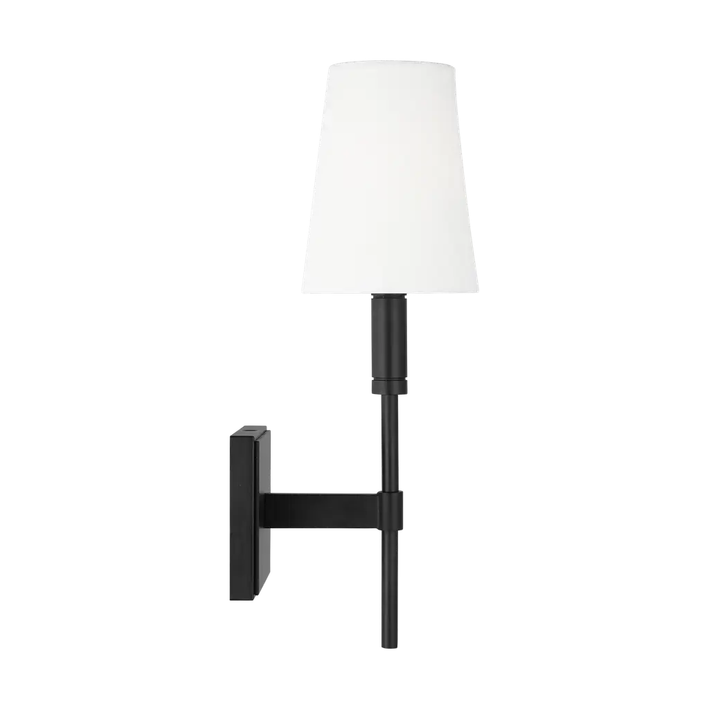Beckham Classic has an understated elegance with a masculine, tailored look that fits well with a range of styles, from transitional to modern. Beckham Classic from Thomas O'Brien has an understated elegance with a masculine, tailored look that fits well with a range of styles, from transitional to modern. The pieces within this family span ceiling, wall, portable, and vanity, so Beckham Classic can complement most living, dining and bath areas. The floor lamp is adjustable in height with a centered lock detail, while chandeliers feature arms welded to a vertical hub. This piece is sure to withstand the test of time. Sleek, traditional fixture will complement hallways, powder rooms, and bathrooms Uses (1) 60-watt Torpedo Candelabra light bulb sold separately; LED compatible. Available in two finish options: Aged Iron, Burnished Brass and Polished Nickel. Damp Rated. Finish: Aged Iron Family: Beckham Classic Designer: Thomas O'Brien Category: Wall Bath Fixture Dimensions: W:5'' H:17'' E:6 3/4'' Shade/Glass: white linen fabric shade Lamping: 1 Torpedo Candelabra 60 watt light bulb Voltage: 120 Number of Bulbs: 1 Max Wattage: 60 Bulb Included: No Safety Rating Location: damp