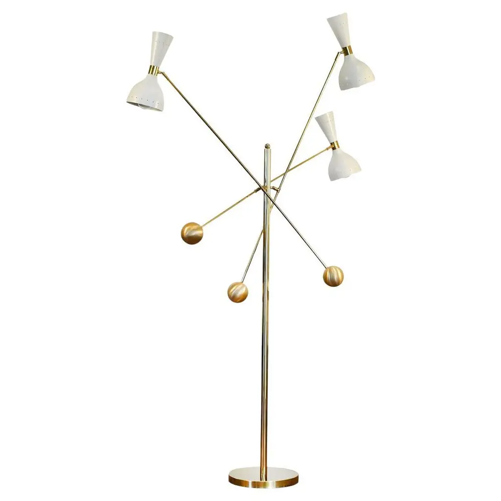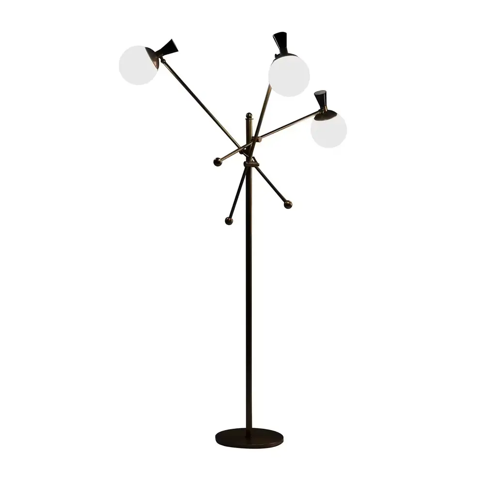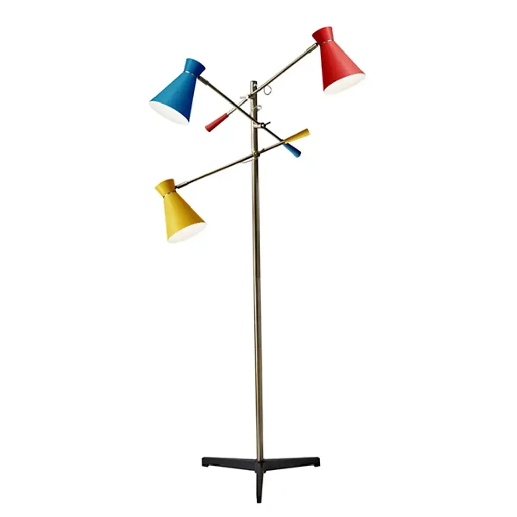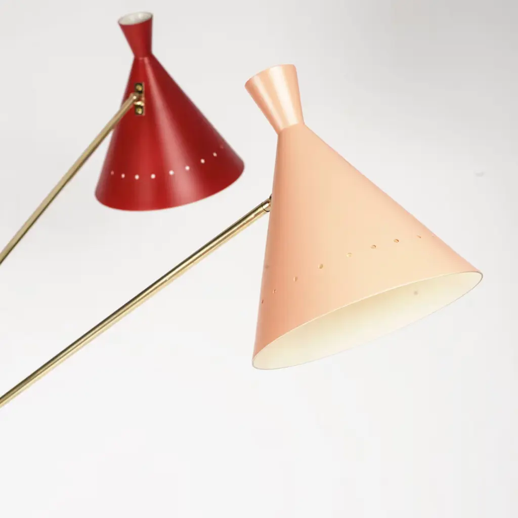 A contemporary and sculptural work of art, this stunning floor lamp will make a statement in any decor, infusing it with its warm light. A tribute to Italian Stilnovo style, it is composed of a slim, long stem ending with three arms supporting three conical shades, two boasting a deep red color and one a delicate pink. Please inquire about the available color customization of the shades.