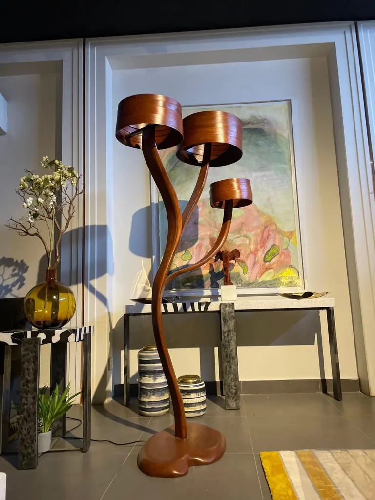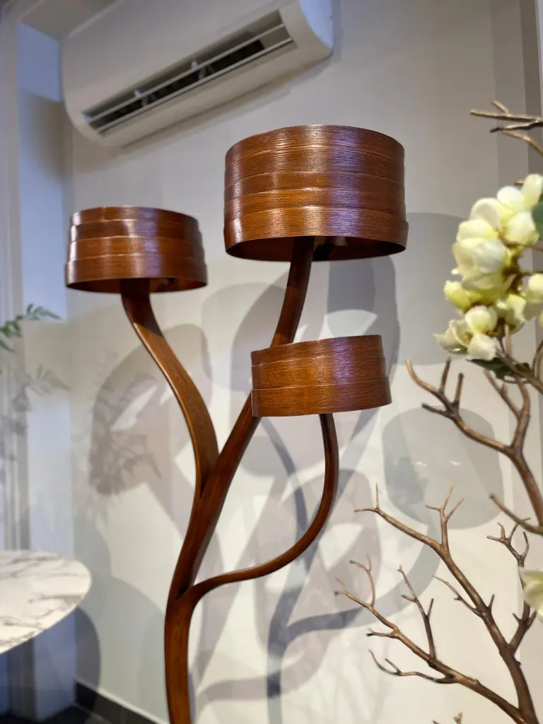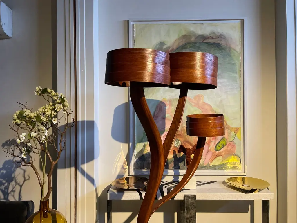 A lighting piece crafted by hand; the piece stems from the base and flows to have three lighting sources, at different levels. All of the lamp shades are different from the other in size; which illuminate the piece and the space around it in a unique way.The Studio has taken its exploration of wood further with the Fluentum Series. This Series uses techniques and skills learned over the years to create works that embody details that are unique to the Studio's design aesthetic and the craft of bending wood. These techniques allow the natural flow of the wood to take the reins of design; therefore, no two pieces are exactly the same, making each piece unique.Other points worth knowing:- The design may vary slightly from the piece in the pictures since each piece is handmade.- You can choose from an array of finishes.- The dimensions of the piece are customizable.