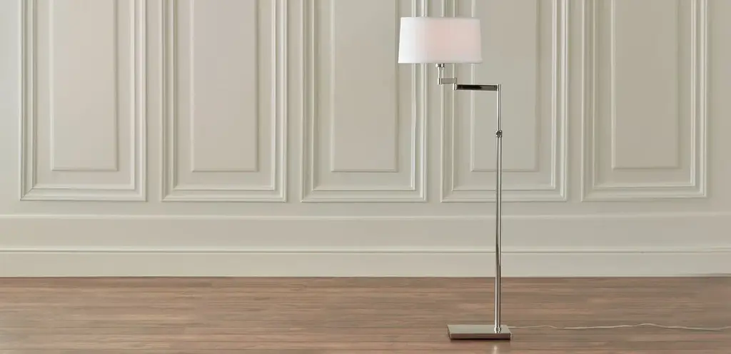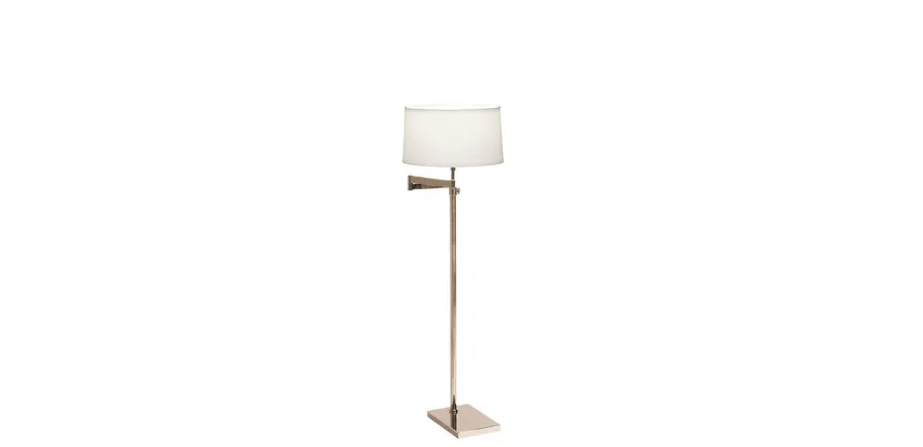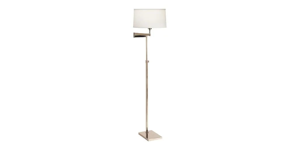 The Tiberius floor lamp's crisp lines and drum shade fit right in with modern and transitional spaces. Its thin linear base slides under a sofa or armchair, and its angular, adjustable arm makes it the perfect companion for evening reading.