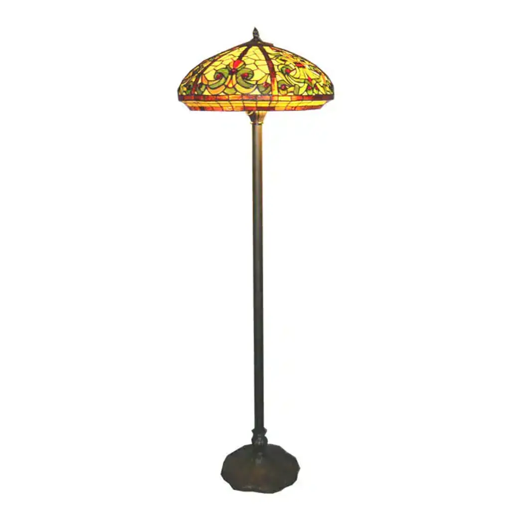 This Tiffany style flower design, 2-light floor lamp features a bronze finish that will add warmth, color and beauty to any room and complement many decors throughout your home. Hand-crafted using the same techniques that were developed by Louis Comfort Tiffany in the early 1900s, this beautiful Tiffany-style lamp contains over 700 hand-cut pieces of bent art glass.Shades: Hand cut pieces of art glass with tones of Blue, Red, and Green.Fixture Dimensions: 65 inches high x 18 inch diameter. Please note: Since these are hand crafted products, the exact color and size of glass pieces may vary. Colors of the glass will appear darker and less vibrant when not illuminated. Handmade glass will vary from one piece to the other; since every piece is hand crafted, sizing may vary. Glass made at different times may also vary in color. Light bulbs used in lamps or ambient lighting may affect the appearance of the products. Stained glass has been protected with mineral oil as part of the finishing process. Please use a soft dry cloth to remove any excess oil. -All photos are taken of the same item. Multiple photos are used show what the product looks like with light on, (brighter image) and with the light off, (darker image).