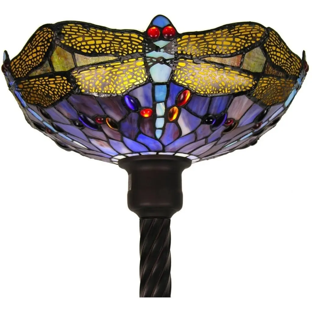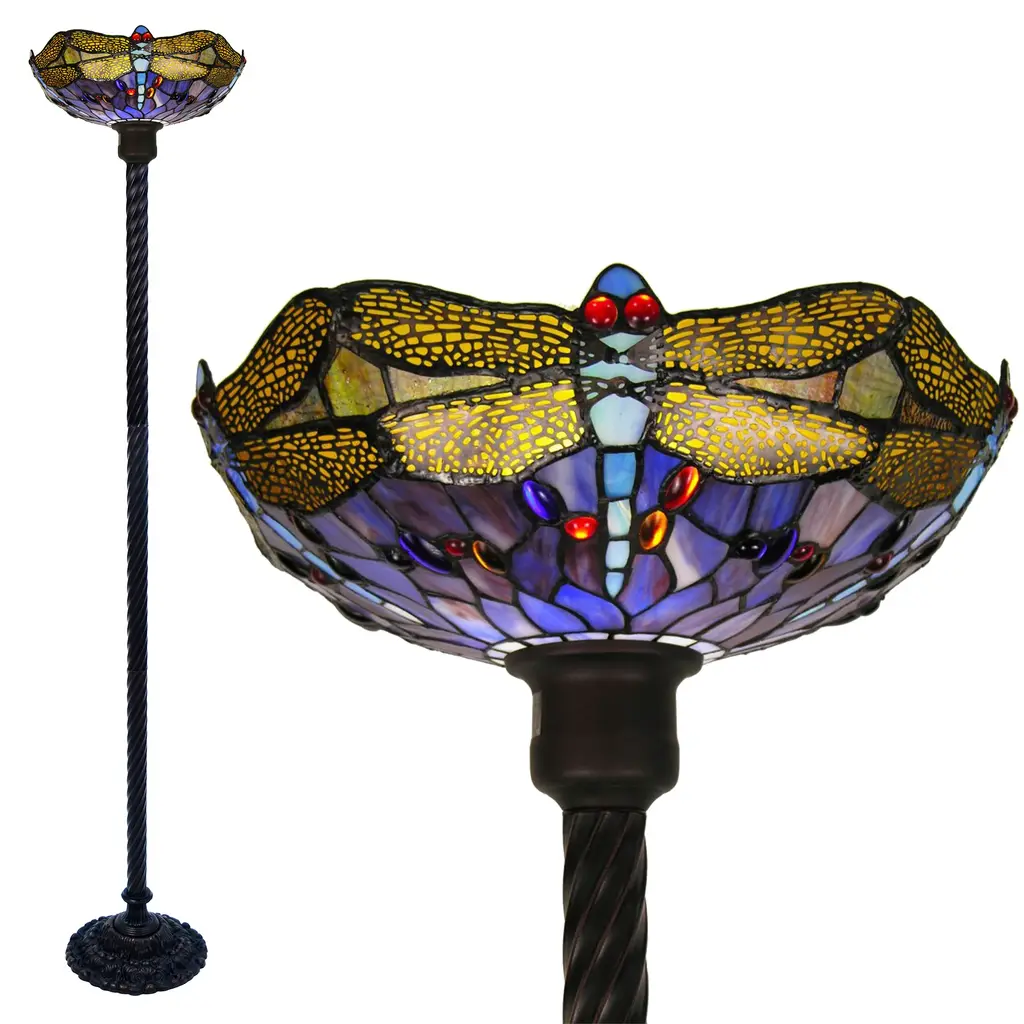 Work nature and color into your decor with this Tiffany-style dragonfly torchiere. This slim floor lamp bursts with color through the yellow, blue, red, and purple hand-cut glass pieces that make up the bowl-shaped shade, and fine copper foil creates a defining look around the edges of each piece for a bold, classic design.Tiffany-style torchiere contains pieces of stained glass, each hand-cut and wrapped in fine copper foilDragonfly design shade contains hues of yellow, blue, red and purpleLighting fixture has a metal base with an elegant bronzetone finishRequires one (1) 100-watt bulbTorchier stands 72 inches tallHandcrafted using the same techniques that were developed by Louis Comfort Tiffany in the early 1900s, this beautiful Tiffany-style piece contains hand-cut pieces of stained glass, each wrapped in fine copper foil.
