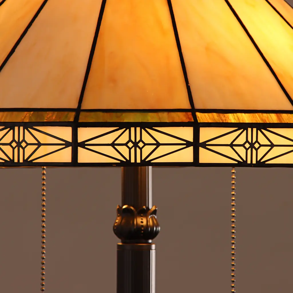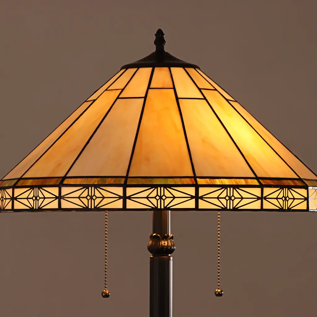 This Tiffany style, Mission design 2-light floor lamp features a blackish bronze finish that will complement many decors throughout your home. Hand crafted from 64 individually hand cut pieces of art glass that will add color and beauty to any room. Beautiful tones of Cream and Brown Art Glass. Requires: Two (2) 100 Watt Max E26 Type A bulbs (Not Included). Product Care: Wipe clean with a dry cloth. Fixture Dimensions: 66.14 inches high x 18.11 inch diameter. Since these are hand crafted products, the exact color of glass pieces may vary. Colors of the glass will appear darker and less vibrant when not illuminated. Handmade glass will vary from one piece to the other; glass made at different times will also vary. Light bulbs used in lamps or ambient lighting may affect the appearance of the products. Stained glass product has been protected with mineral oil as part of the finishing process. Please use a soft dry cloth to remove any excess oil.