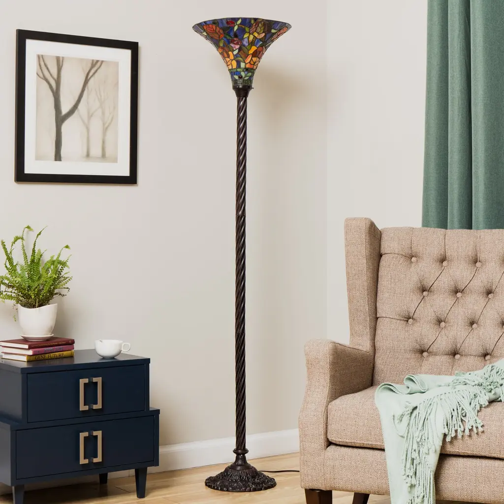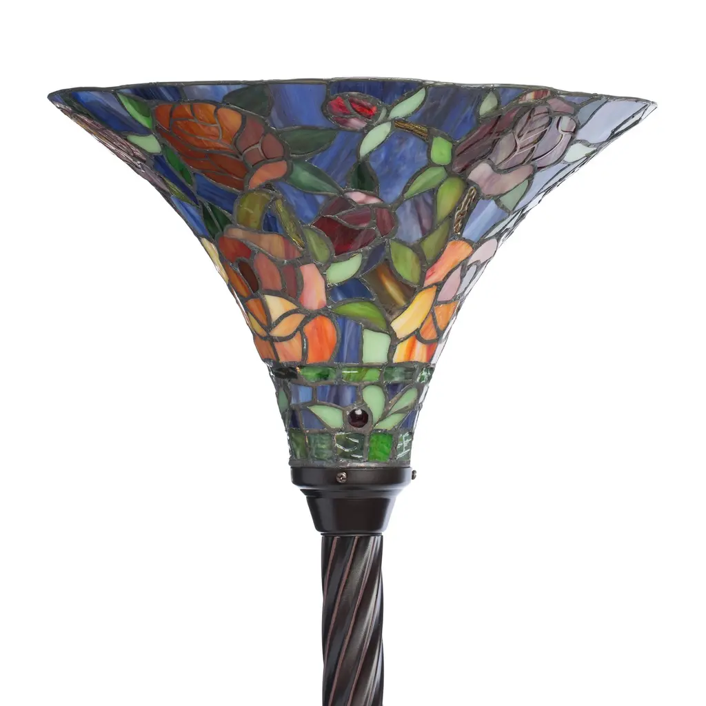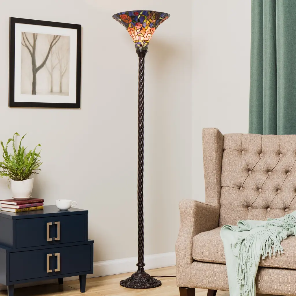 Cast a gentle glow over your bedroom or family room with this Tiffany-style floor lamp. This handcrafted lamp's intricate shade and flared design combine with its traditional glass and copper materials to give it a touch of retro splendor, while its floor switch and bright bulb deliver powerful modern illumination.Tiffany-style Rose torchiere features an exquisite stained-glass design and beautiful array of colors to enhance the beauty of a roomMade of art glass, copper and metal and handcrafted using Louis Comfort Tiffany's original methods for quality and durabilityUses a foot switch for convenienceMeasures 72"H and uses one 100-watt bulb to provide ample lighting