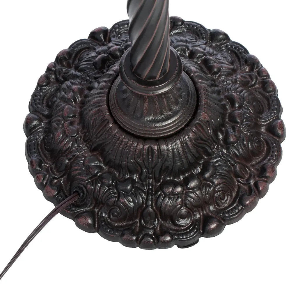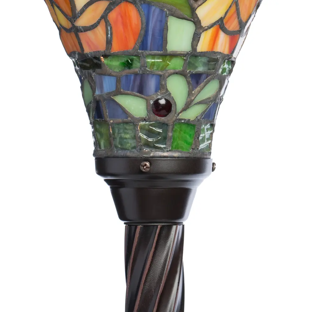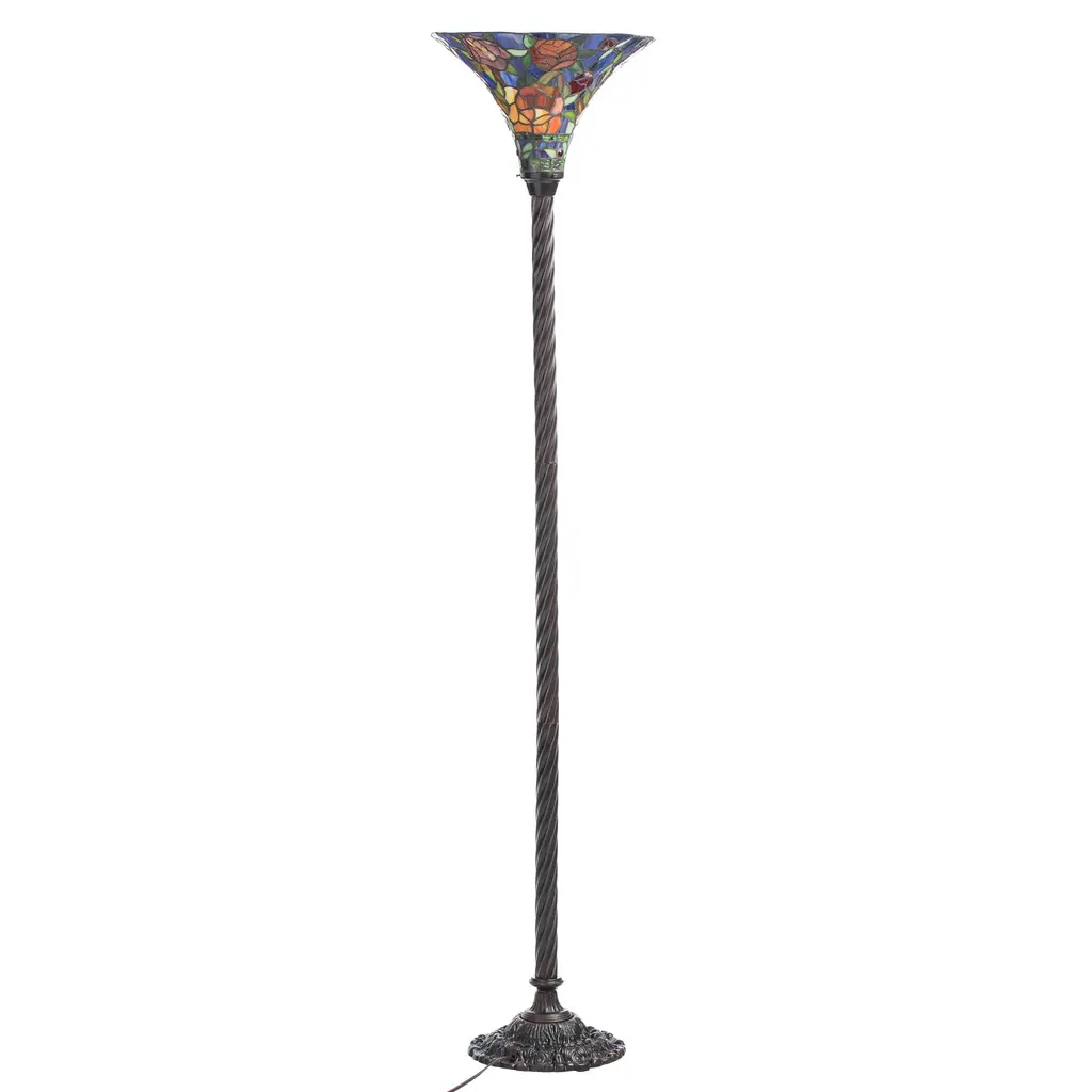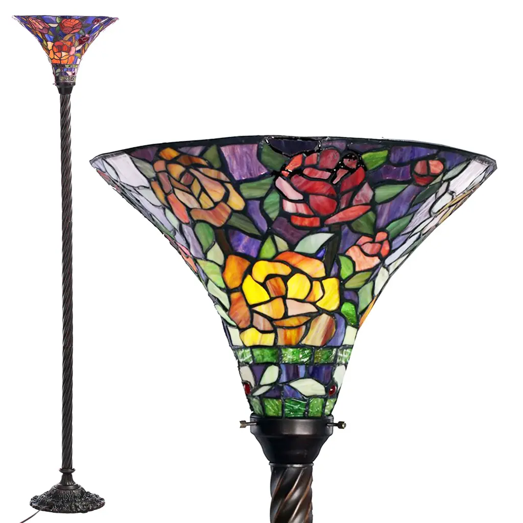 Cast a gentle glow over your bedroom or family room with this Tiffany-style floor lamp. This handcrafted lamp's intricate shade and flared design combine with its traditional glass and copper materials to give it a touch of retro splendor, while its floor switch and bright bulb deliver powerful modern illumination.Tiffany-style Rose torchiere features an exquisite stained-glass design and beautiful array of colors to enhance the beauty of a roomMade of art glass, copper and metal and handcrafted using Louis Comfort Tiffany's original methods for quality and durabilityUses a foot switch for convenienceMeasures 72"H and uses one 100-watt bulb to provide ample lighting