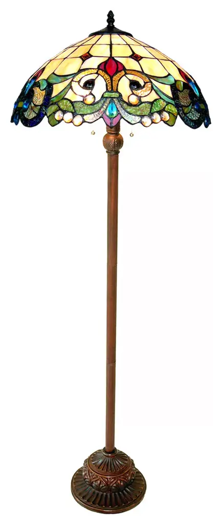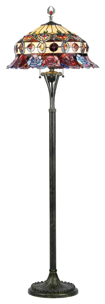 This Tiffany style Victorian design 2-light floor lamp features a dark bronze finish. Hand crafted from over 360 individually hand cut pieces of art glass that will add color and beauty to any room. Hand-crafted using the same techniques that were developed by Louis Comfort Tiffany in the early 1900s, this beautiful Tiffany-style piece contains hand-cut pieces of stained glass, each wrapped in fine copper foil. Shades: Tones of Ivory, Green, and Red art glass. Requires: Two (2) 100-watt medium base bulbs (Not Included). Fixture Dimensions 64 inches high x 18 inch diameter. Attention California residents: This product may contain lead, a chemical known to the state of California to cause cancer and birth defects or other reproductive harm. Please note: Since these are hand crafted products, the exact color and size of glass pieces may vary. Colors of the glass will appear darker and less vibrant when not illuminated. Handmade glass will vary from one piece to the other; since every piece is hand crafted, sizing may vary. Glass made at different times may also vary in color. Light bulbs used in lamps or ambient lighting may affect the appearance of the products. Stained glass has been protected with mineral oil as part of the finishing process. Please use a soft dry cloth to remove any excess oil. -All photos are taken of the same item. Multiple photos are used show what the product looks like with light on, (brighter image) and with the light off, (darker image).