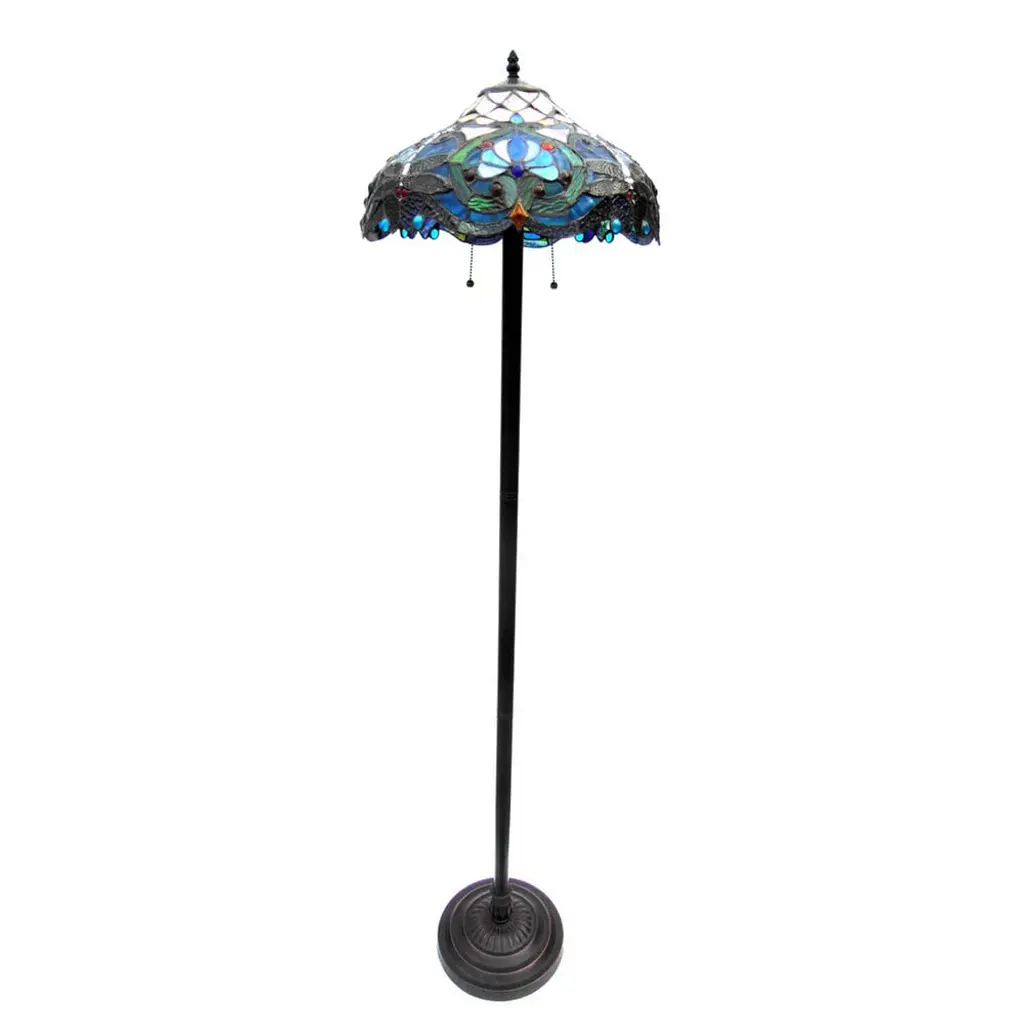 Illuminate your traditional decor with this Tiffany style floor lamp. The bronze-finished metal base is paired with a hand-cut blue, beige, and aqua art glass shade, detailed with a dragonfly design and cabochons. Easily turn this piece on and off with the pull chain switches. Features: