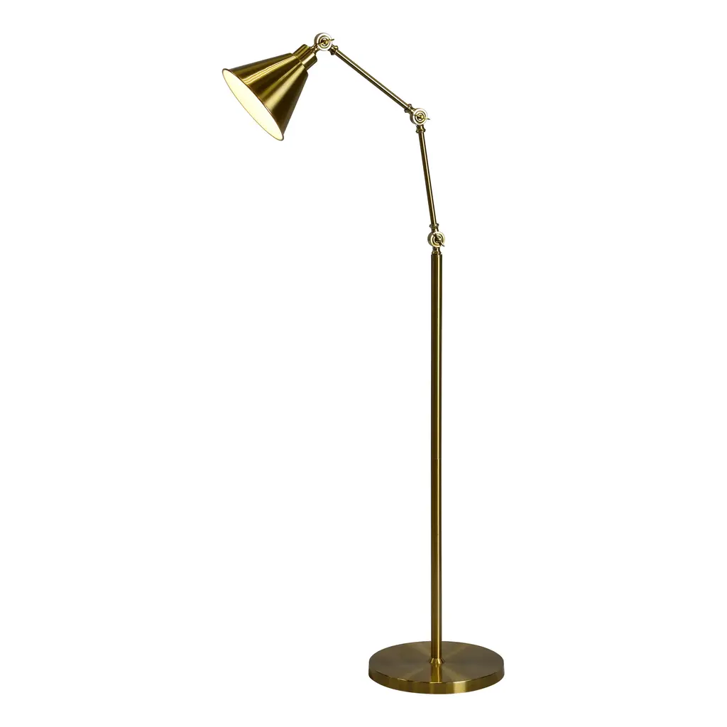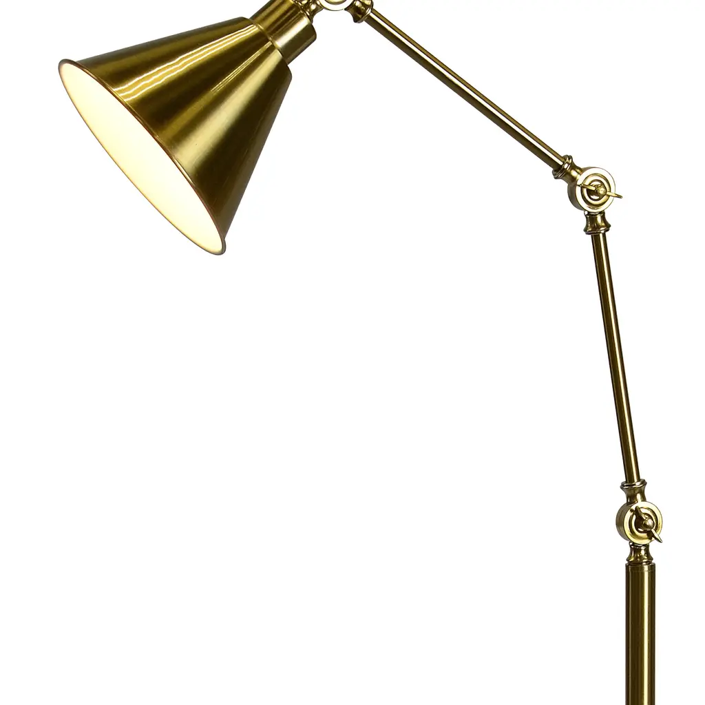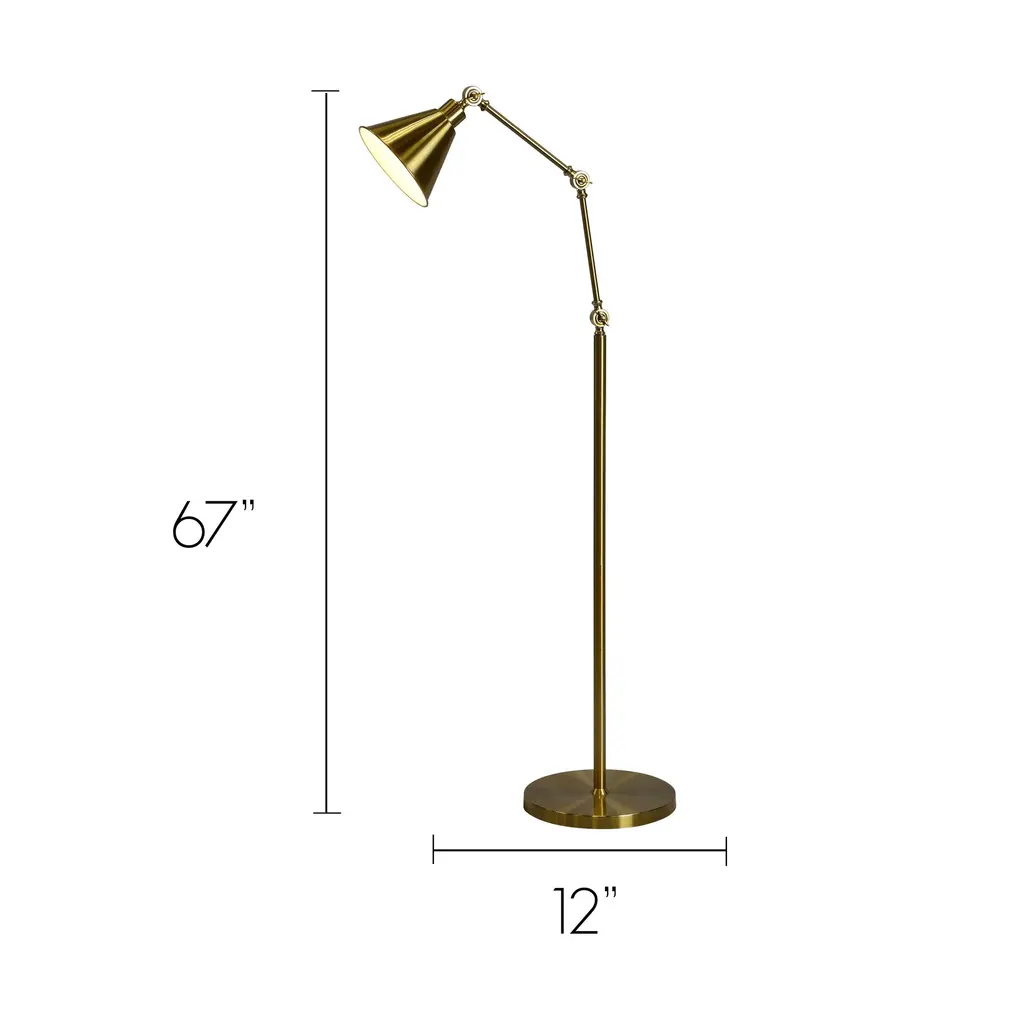 The Tim floor lamp features a metal construction with an antique brass finish and a metal cone shade. This lamp stands approximately 67 inches tall and has three adjustable pivot points, allowing you to get the perfect angle of lighting for your room or task. The Tim features an on/off foot pedal switch for convenience and uses a 40 watt maximum standard base bulb (not included).