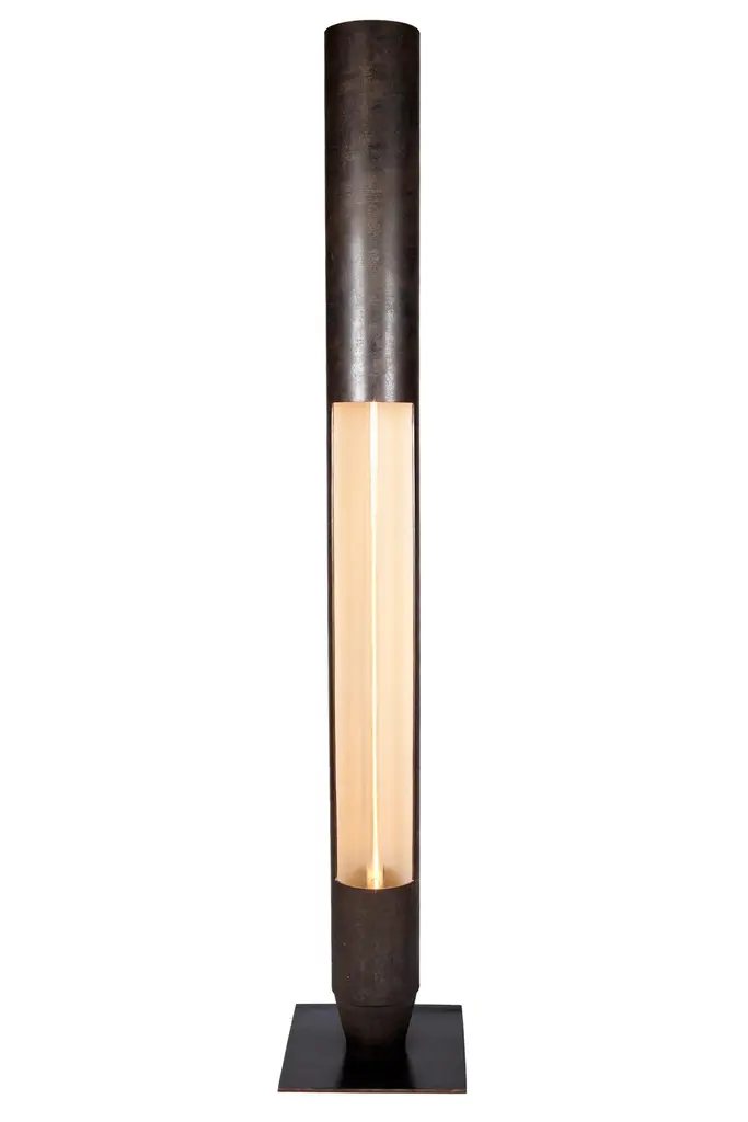 Floor lamp made of rough steel which is patinated. Inside covered with white chalk paint.Transparent led lamps inside.