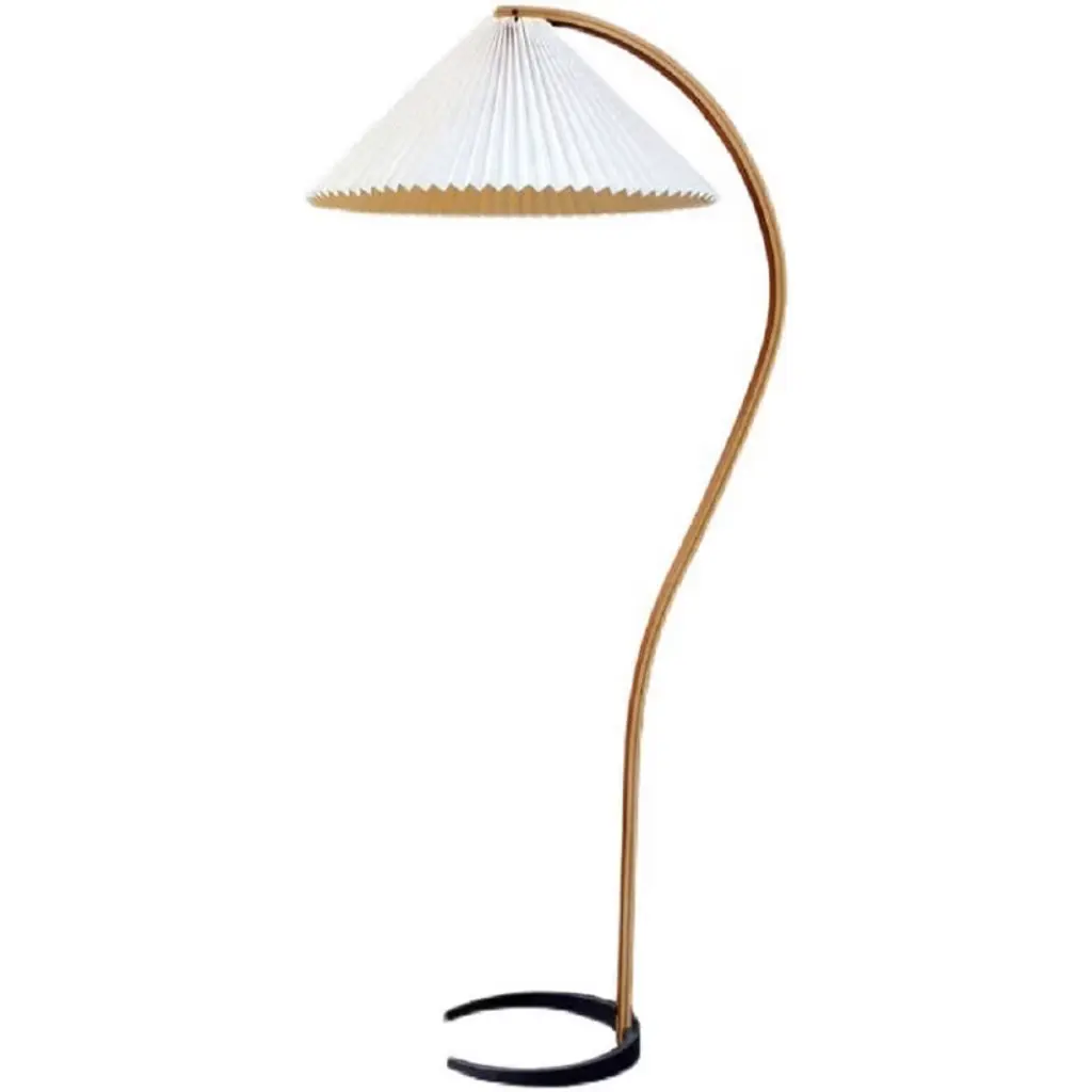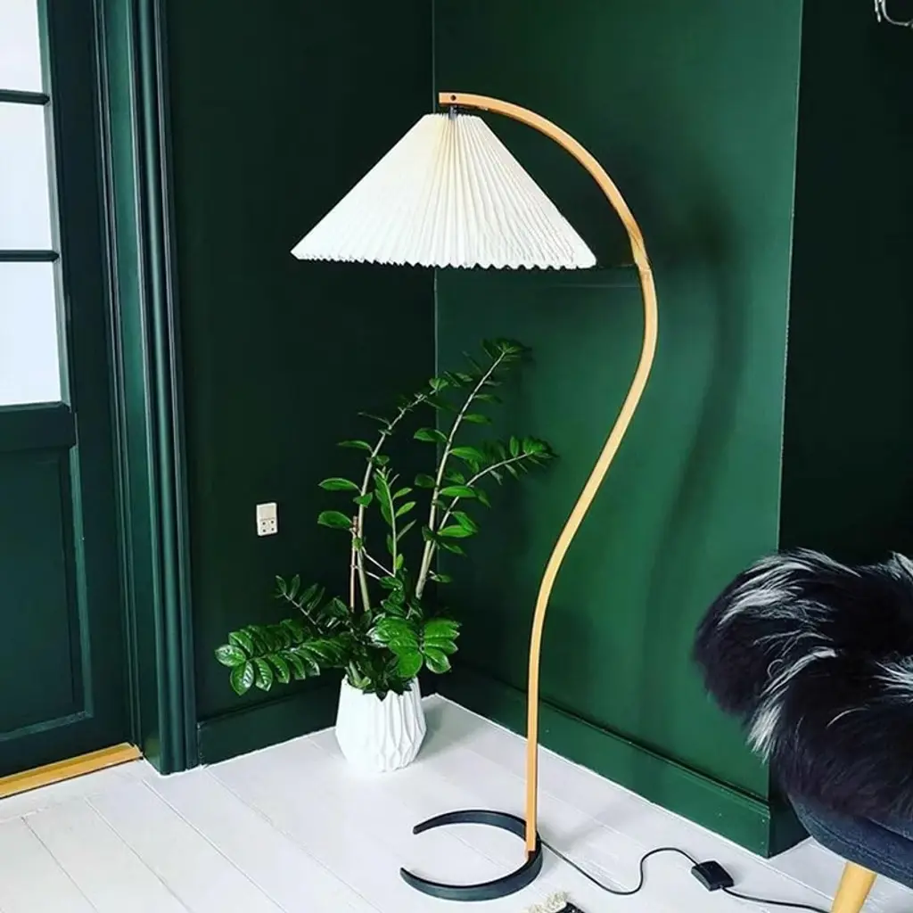 This retro lamp creates a warm glow to your living room, bedroom, office or dining room and brings modern farmhouse charm to your home. Featuring sculpted curved plywood supports with elegant curves, cast iron crescent base and original pleated linen shade. The black metal base adds a touch of industrial flair, making it a versatile floor lamp. It's perfect for your home office or study, bedroom, or as a versatile floor lamp for any room in your home like living or dining room. Beautiful and ideal lamp for mid-century modern, traditional and boho decor.