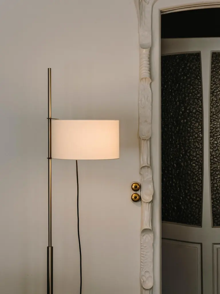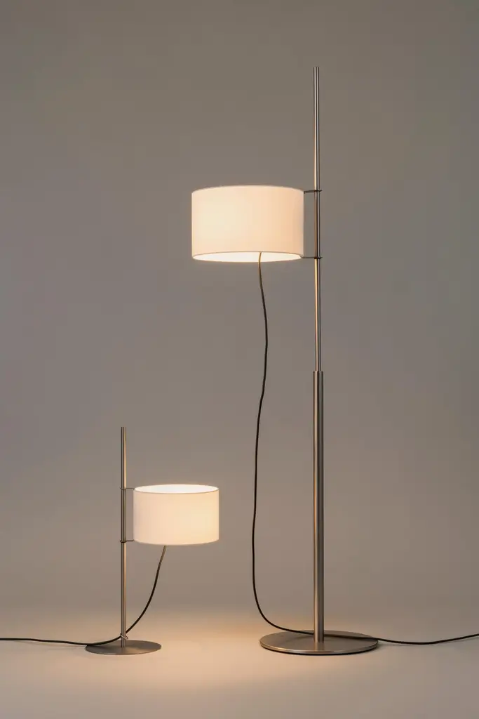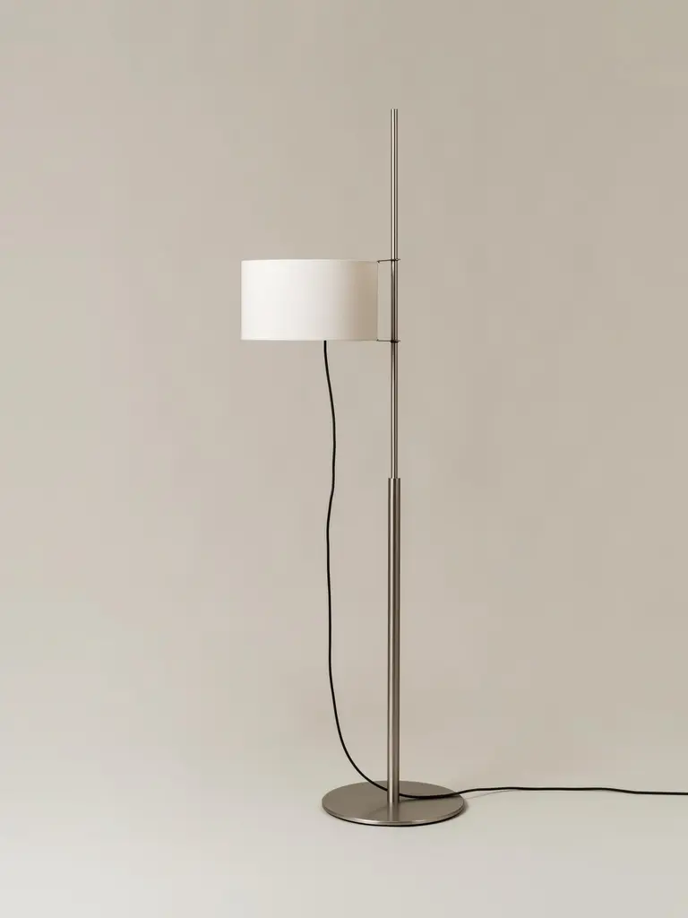 TMD floor lamp by Miguel MiláDimensions: D 33 x W 55 x H 171 cmMaterials: Nickel, linen.With a structure supported by a circular metal base, the while linen shade of the TMD lamp looks like a sail hoisted on a mast. Whether switched on or off, the TMD manages to add warmth to the space around it. Another example of the timeless sobriety of Miguel Milá.Height-adjustable white linen lampshade. The light is switched on/off by pulling softly from the cable.Santa & Cole is a small, independent and global editor of design products, with its roots in Belloch (Barcelona, Spain). We have been editing since 1985, when the company was first founded. By editing we mean preparing a work for the public domain, we mean adapting an item for everyone’s use. What a book editor does with stories, we do with objects.More than eighty creators have contributed to a rich catalogue of furniture and lighting products originating in very different contexts, by renowned designers such as Antoni Arola, Miguel Milá, André Ricard and llmari Tapiovaara.Acute and attentive to quality and detail, Santa & Cole outsources all of its industrial production to an extensive network of suppliers, mainly in Spain, but also in other countries such as Japan, where the washi paper for our Tekiò lamp is made.Our mission is to build, safeguard and disseminate knowledge through design objects. Objects whose quality is recognisable at the touch of a hand, and that enrich people’s lives, whether at home or in shared environments. Our philosophy is more modern than futurist and we are more intrigued by silence than by stridency.Our focus is not the present market, but the future one; not Barcelona, but the world; not fashion, but history.All our lamps can be wired according to each country. If sold to the USA it will be wired for the USA for instance.