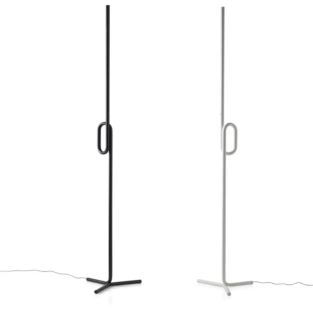 With its compact footprint, slender body and no-shade design, the Tobia Floor Lamp is ideal for making a statement in small spaces. The design’s body emits light from the top that reflects from your ceiling and creates a warm atmosphere. A stylish flourish is created by a loop in the center of the lamp’s slim body. The Tobia is made by Foscarini, a manufacturer with work in MoMA's collection.Features of the Tobia Floor Lamp include: Three-pronged base provides stability. Adjustable and dimmable with a touch dimmer. Bulb: 1 LED/15W/120V. 2,000 lumens. Powered by standard plug-in. 63” cord length. Made from aluminum. Measures 69h x 11"diam. at the base.