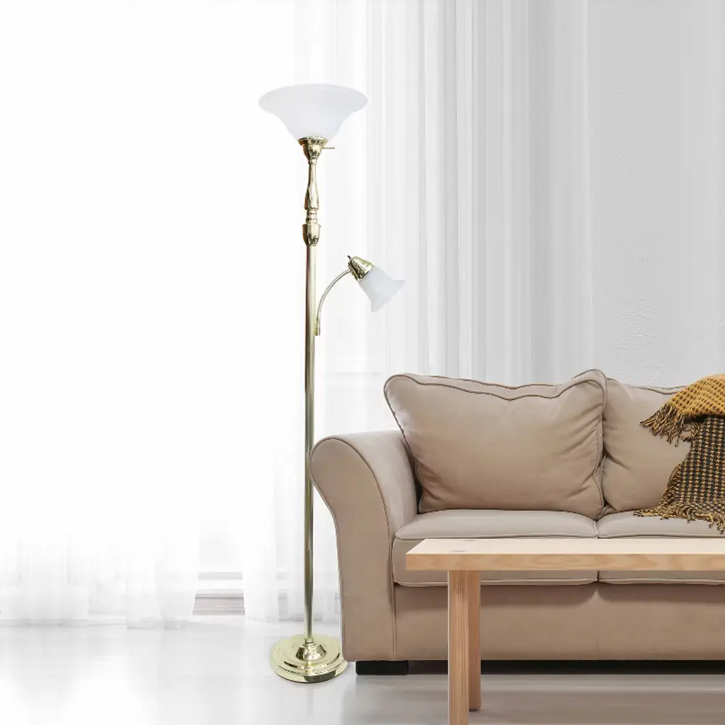 Brighten up your living space with this elegant 2 light 71.75" floor lamp. It features 1 adjustable reading light to focus on the area of your choice, paired with a traditional torchiere main light. The beautiful metal base is accented by scalloped glass shades to complete the timeless look. Perfect for your bedroom, office, foyer or living room!