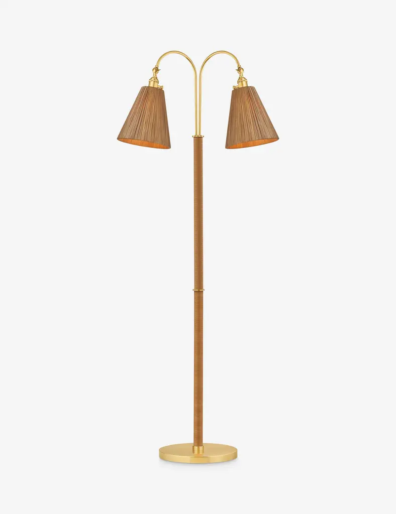 Torquay pairs elegant lines with natural texture warmth. This floor lamp features dual swivel shades and a rattan-wrapped base, for a soft, organic touch. Use this decorative floor lamp to anchor a reading nook or lounge space with directional light and easy charm.
