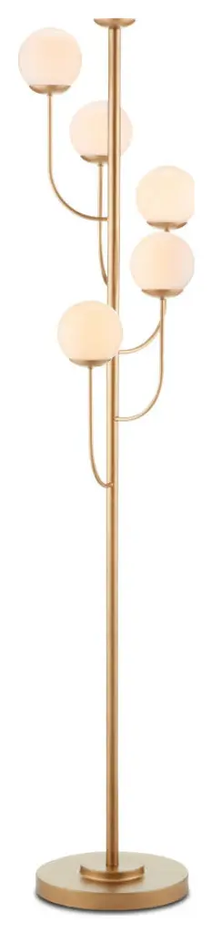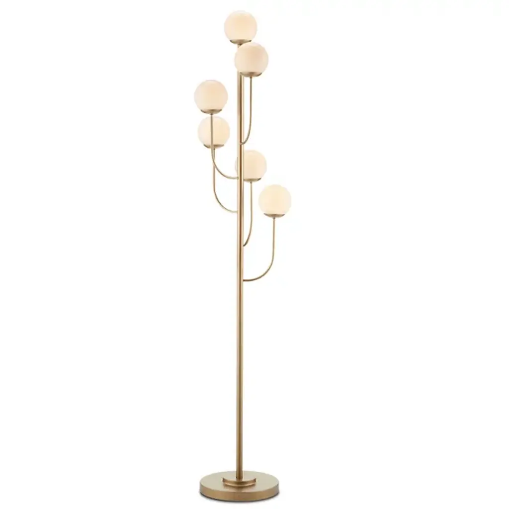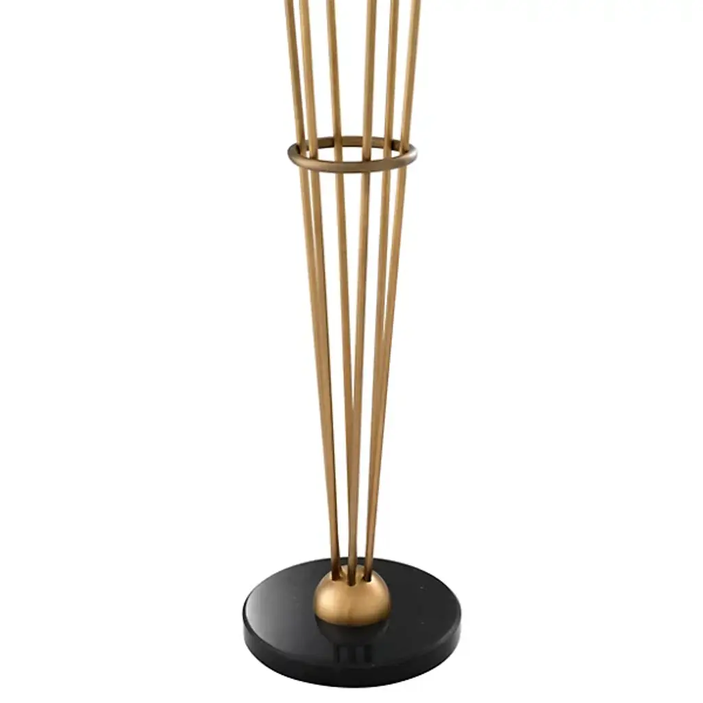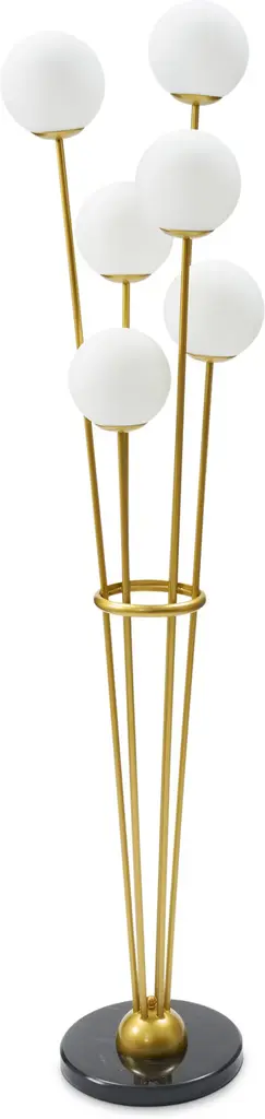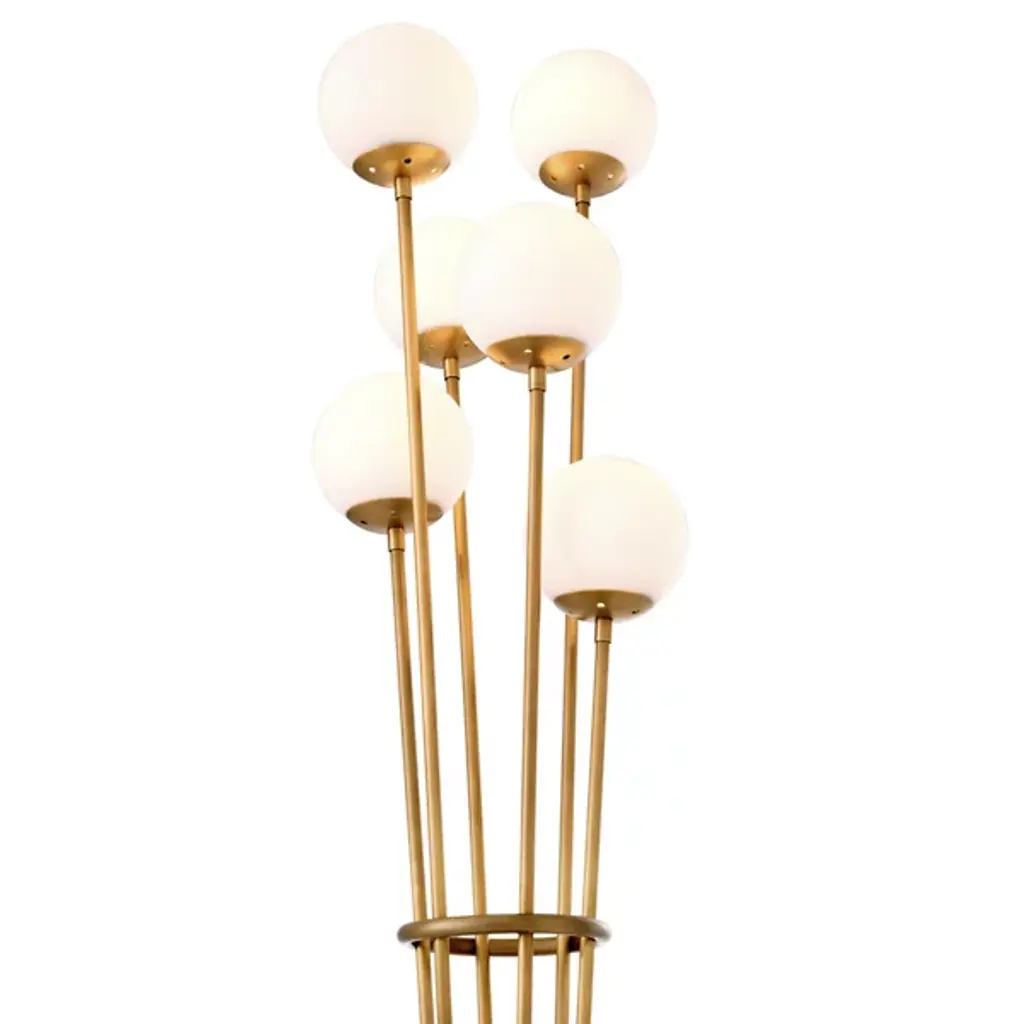 Modern and chic, the Tortora Floor Lamp by Eichholtz adds an artful touch to any room with its stylish composition. Anchored by a circular base with a bold finish, a smooth dome creates the foundation for a series of slender stems to reach upward from. Gathered together by a halo around the center of these stems, each one supports a glass globe above its form. Each shade is set at a different height and is paired with a neat metal cap at its base. Reminiscent of an oversized, minimal bouquet, this arrangement brings a soft, welcoming glow to its surroundings.