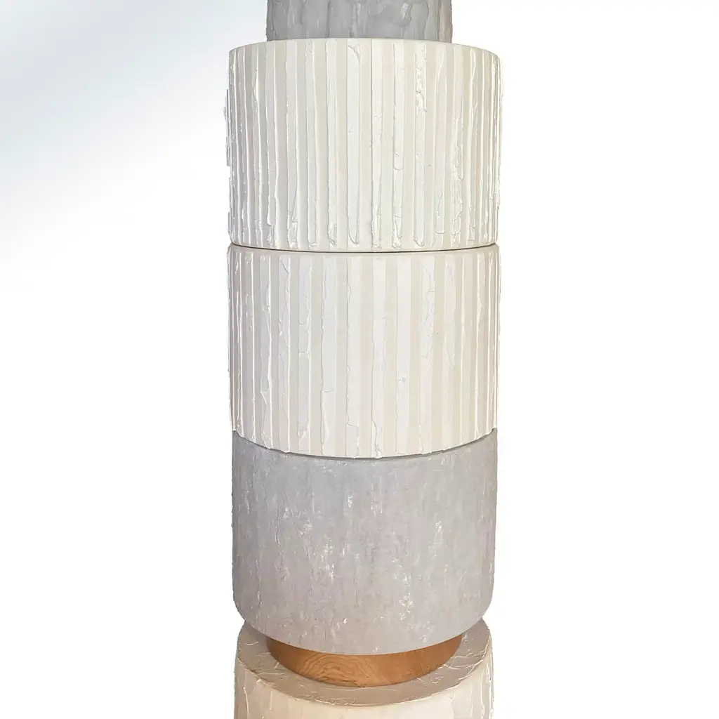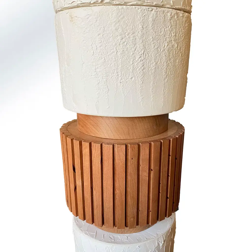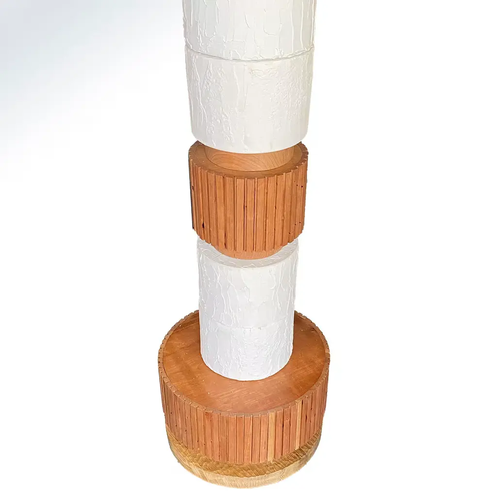 A singular and captivating design of strong visual impact, this floor lamp inspired by totem poles is sure to be the focal point in a modern living room or home office. Combining ceramic and solid cherry, it rests on a finely engraved durmast base and features a sculptural main body composed of cylindrical ceramic elements worked on a lathe and decorated by hand with channeled or uneven textures. The individual number and signature attest to the piece's uniqueness.