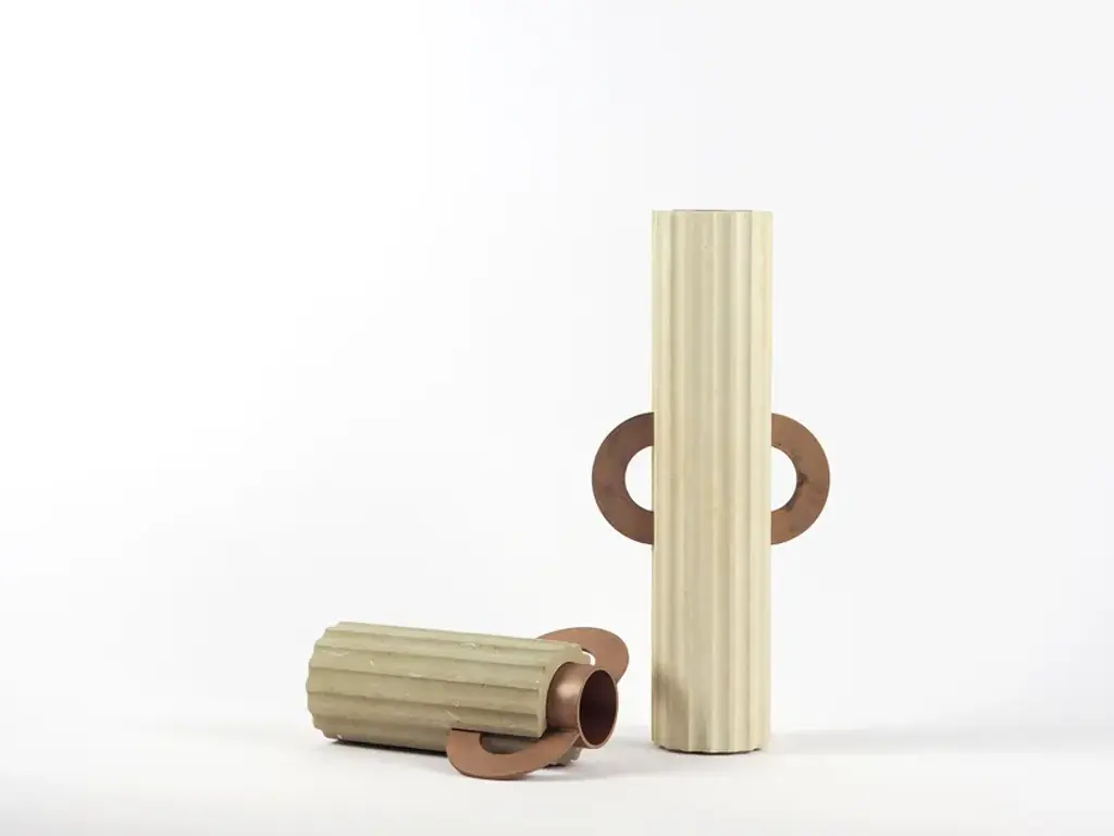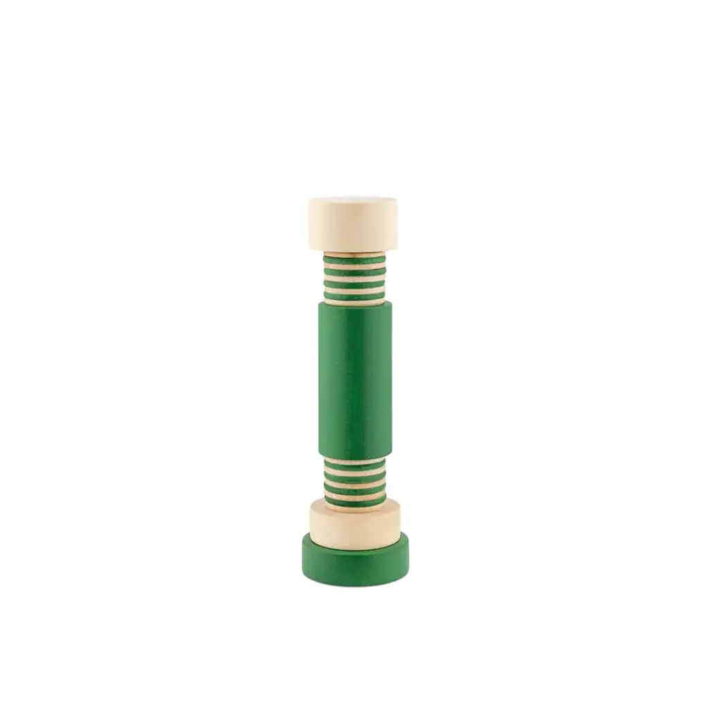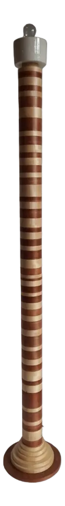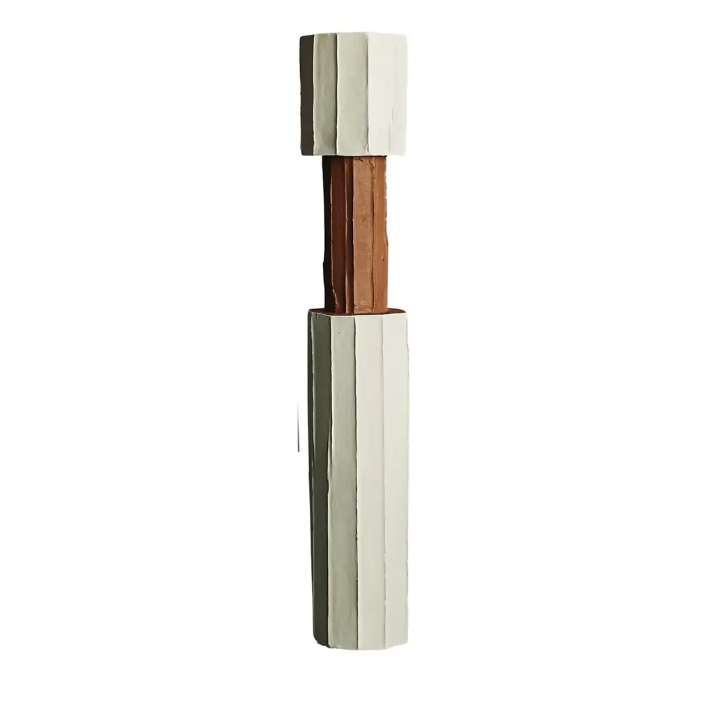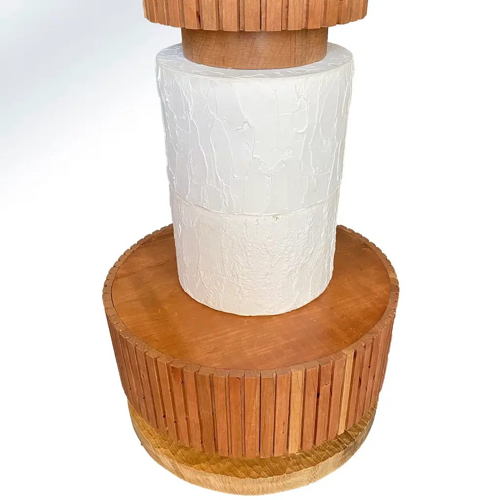 A singular and captivating design of strong visual impact, this floor lamp inspired by totem poles is sure to be the focal point in a modern living room or home office. Combining ceramic and solid cherry, it rests on a finely engraved durmast base and features a sculptural main body composed of cylindrical ceramic elements worked on a lathe and decorated by hand with channeled or uneven textures. The individual number and signature attest to the piece's uniqueness.