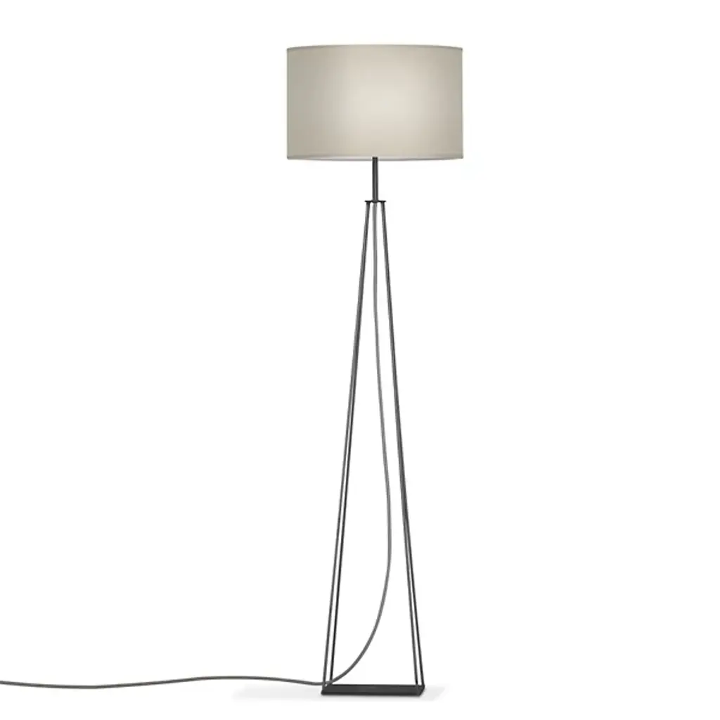The Tower Floor Lamp from Seascape Lamps uses an unusual triangular structure to create a fixture that looks good from any angle. Built from quarter-inch steel rod and a heavy metal base, this lamp stands with absolute stability on any floor surface. The three-sided frame rises to support a simple drum shade that distributes light evenly in all directions. A mesh-covered cord runs along one edge, adding a small but intentional detail to the minimal frame. This piece works perfectly beside reading chairs, next to couches, or in corners that need additional illumination.