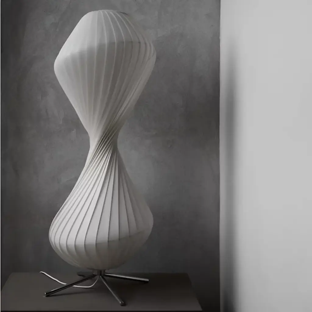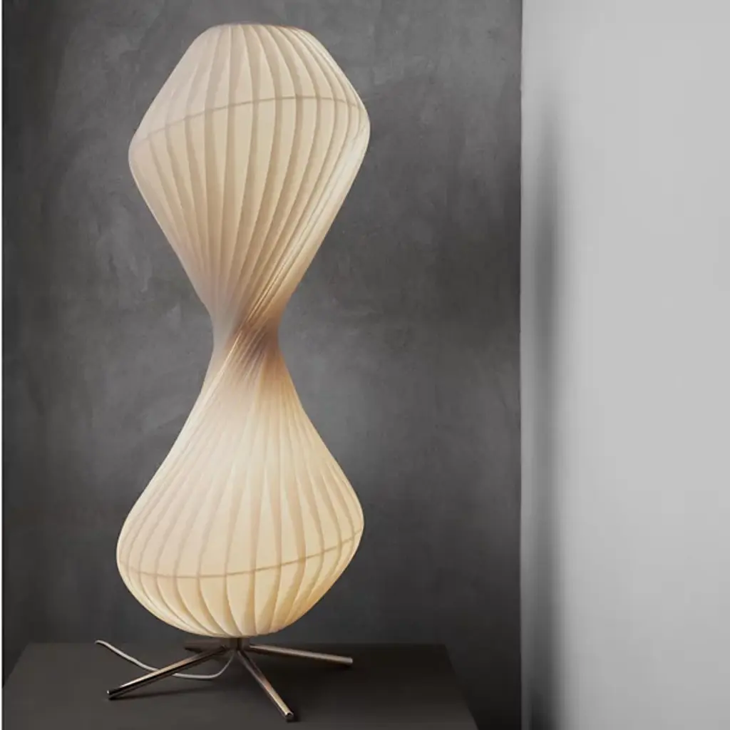The TR32 Floor Lamp from Tom Rossau offers a soothing blend of sculptural form and ambient light. Designed and made in Denmark, this tall lamp rises from a low-profile, four-legged metal base and features an hourglass shade made from spiraling planks of translucent screen material. The shade diffuses light softly and evenly, creating a warm, inviting glow. The swirling silhouette is inspired by the soft contours and luminous landscapes of Rossau’s childhood in Odsherred, where light and nature unite in perfect harmony.