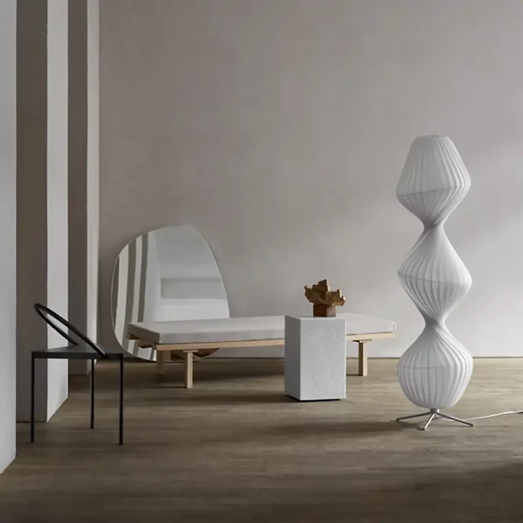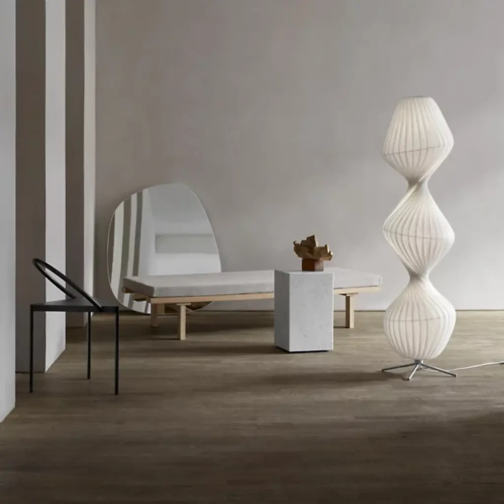 The TR33 Floor Lamp from Tom Rossau provides an airy, abstract addition to large inside spaces needing artistry and ambient light. The shade is a vertical column of translucent screen shade material stretched around a slim inner frame, with swirls on the outside expanding and contracting outside rounded regions. The rounded shapes provide an organic appeal, calling to mind the rolling hills and ethereal illumination of Tom Rossau’s childhood home in Odsherred, giving the same kind of imagination and ease to any environment the handmade lamp illuminates.