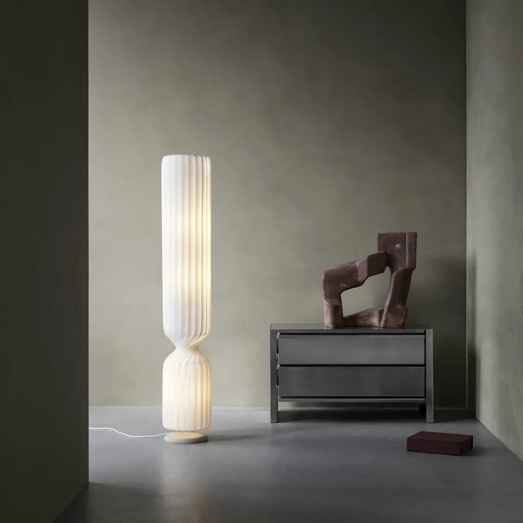 The TR41 LED Floor Lamp from Tom Rossau showcases a distinctive Nordic design with its sculptural, asymmetrical slatted form. Available in three sizes, it features a unique hourglass silhouette created by narrowing at the top, bottom, and lower center, offering a striking contrast to its soft slats. Nominated for the 2021 Design Awards’ “Lamp of the Year,” the TR41 combines refined craftsmanship with bold visual appeal, making it a sophisticated centerpiece for any interior. Highlights