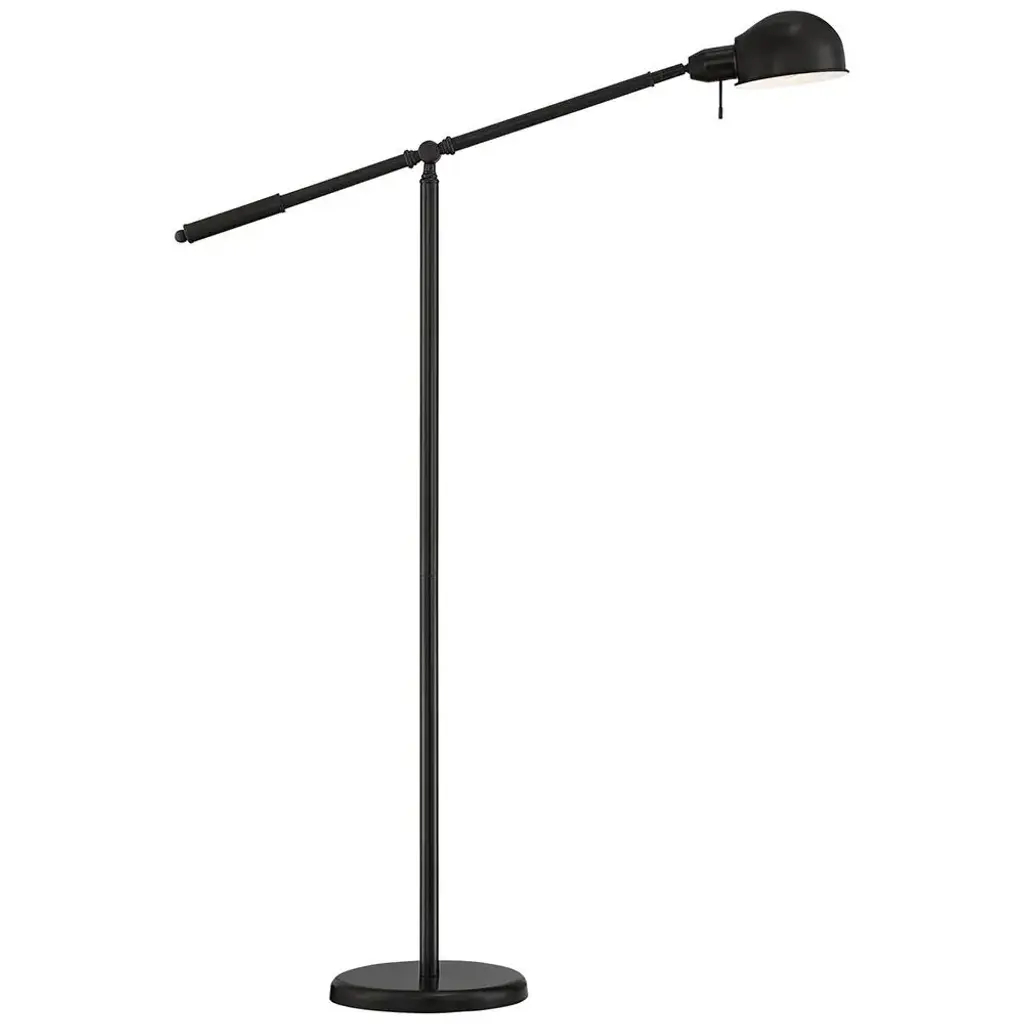 PRODUCT DETAILS: Adjustable from 33" to 55" high. Base is 10" wide x 1" high. Shade is 5 3/4" wide x 3 1/2" high. Weighs 9 lbs. Boom arm is 20" from pole including light. Counterweight balance arm is 14". Takes one maximum 60 watt standard base bulb (not included). On-off rotary switch on the socket. Classic adjustable pharmacy floor lamp with USB dimmer from the 360 Lighting brand. Dark bronze finish over metal construction. Adjustable boom arm and dome lamp head. Comes with 5-feet of black cord. 8-foot long white plug-in tabletop dimmer with type-2.0 USB port. Dimmer has a 100 watt maximum capacity. DESCRIPTION: Upgrade the lighting in your space with this classic adjustable pharmacy floor lamp in a dark bronze finish. From the 360 Lighting brand, the low-profile design has a boom-style arm that can be adjusted to cast light at a variety of angles. A sleek metal shade creates ample downward illumination in your space. The tabletop dimmer works with dimmable CFL and dimmable LED bulbs, as well as halogen and incandescent bulbs, and it also comes with a built-in USB port, allowing you to easily charge phones and other devices.