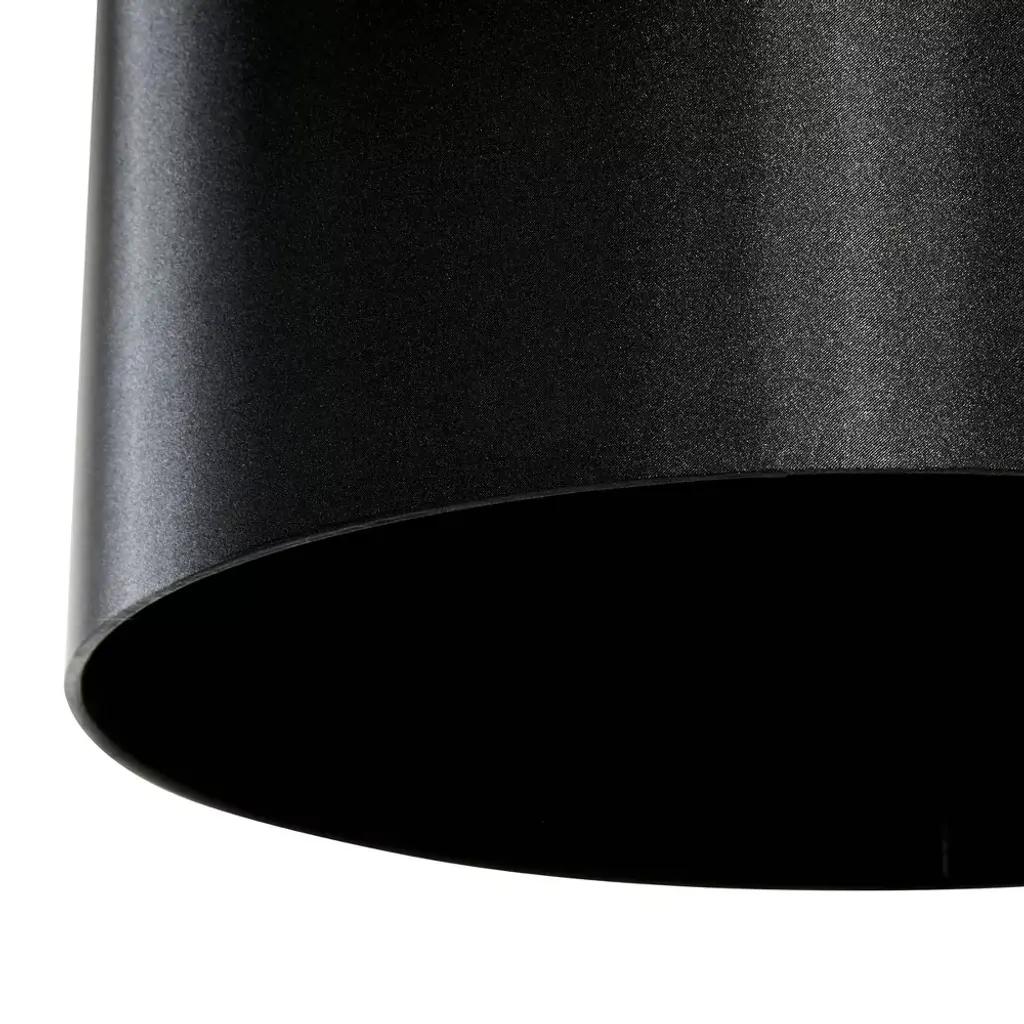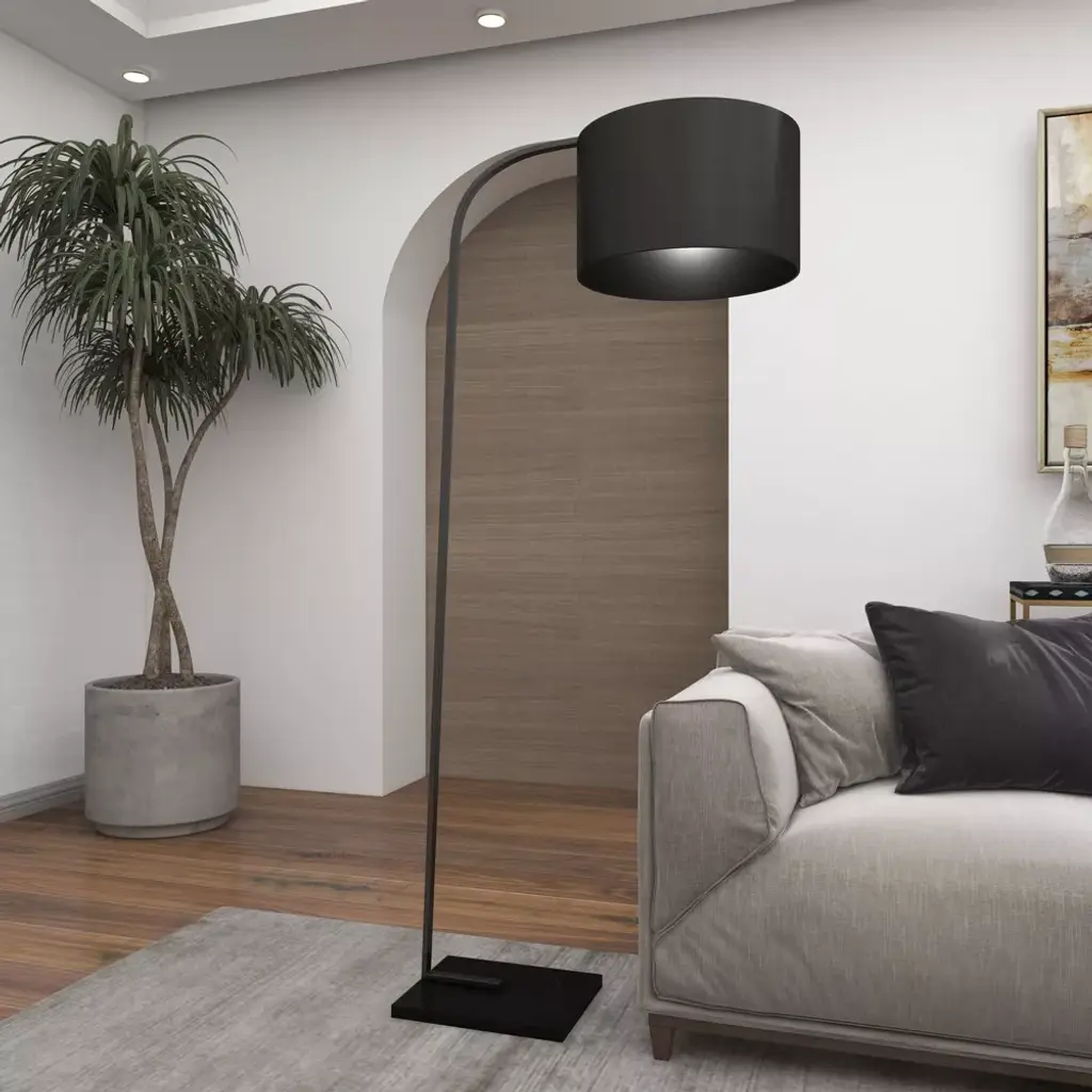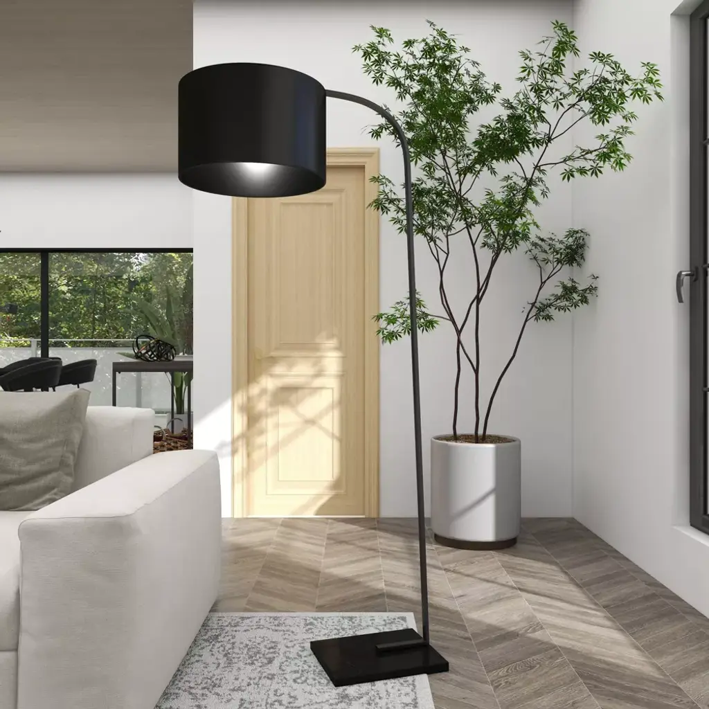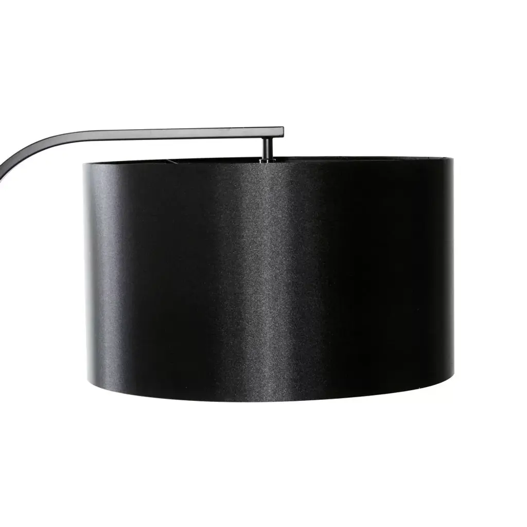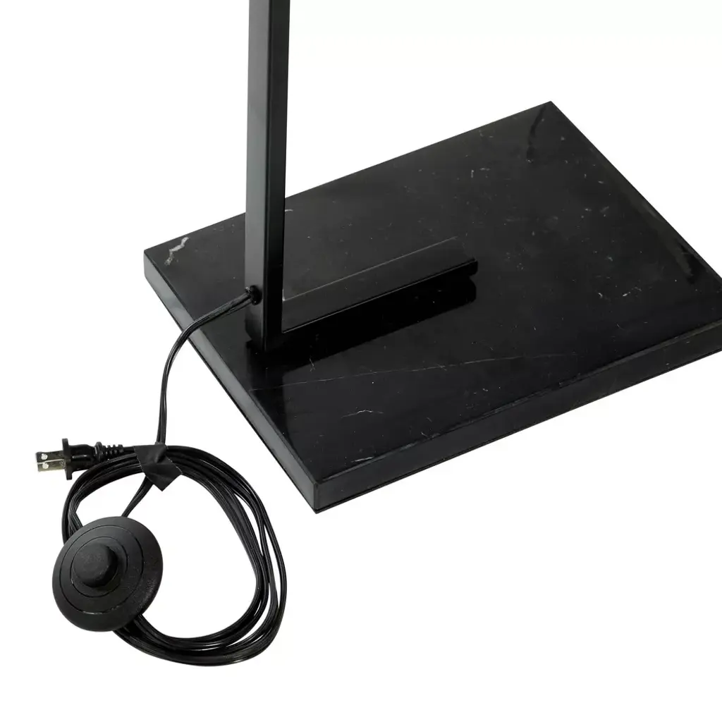 The peak of traditional style, this solid black floor lamp is monochrome from top to bottom. The black polyester drum lamp shade had a slight sheen and heavily diffuses light for an ambient glow. The thin black metal stem has a matte black finish and connects into the rectangular, solid black marble base with light veining. Uses one standard E26 bulb (not included). This black floor lamp has a 61" cord length. Suitable for indoor use only. This floor lamp is topped with a metal drum shade. Convenient floor foot switch. This item comes shipped in one carton. Traditional style.