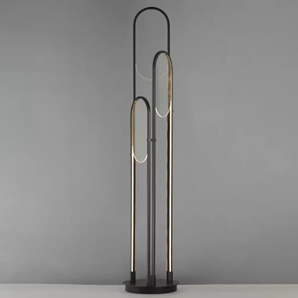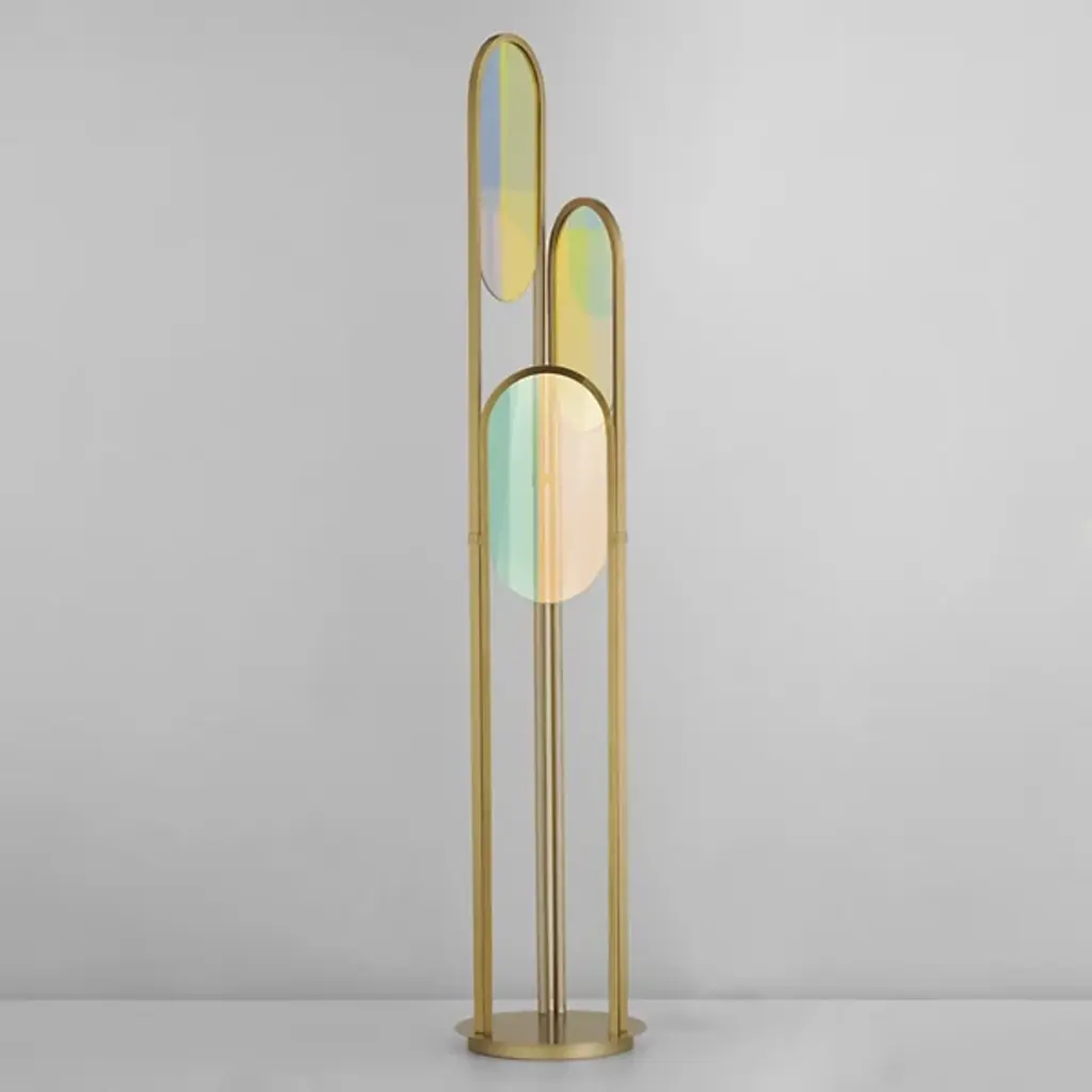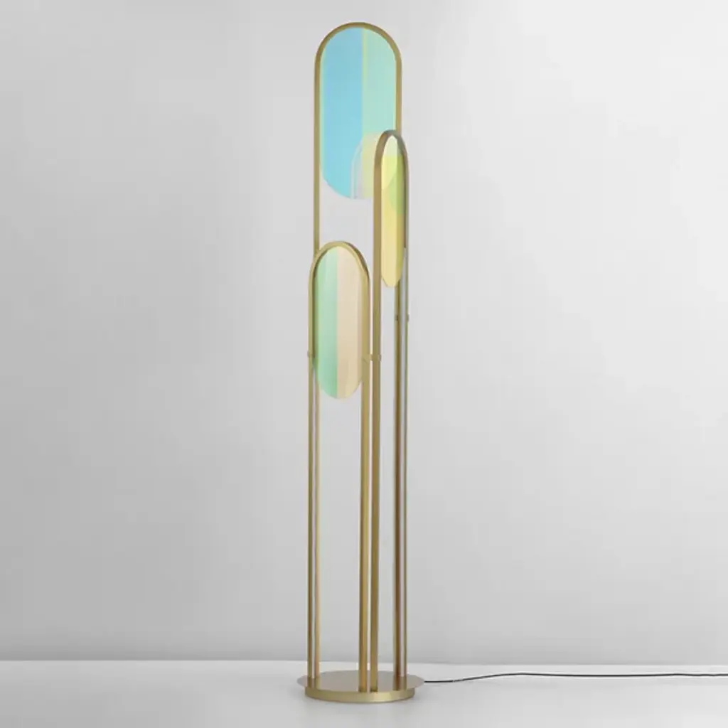 With a striking minimalist design, the Trance LED Floor Lamp from Studio M features oval frames finished in Natural Aged Brass, which elegantly illuminate floating dichroic glass panels. As light passes through these panels, subtle iridescent hues are revealed, intensifying as the layers of glass overlap, adding a vibrant and colorful element to the lamp's aesthetic. This floor lamp is made from steel and aluminum and combines sleek modernity with bold visual impact, making a captivating statement in any contemporary space.